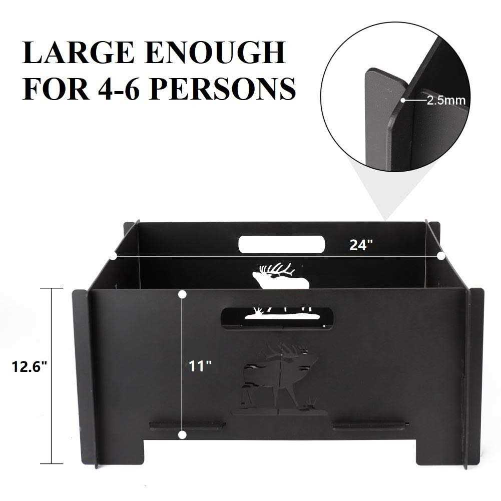 【Safe & Secure】Crafted from heavy-duty iron, fire pit features a black coating that can resists high-temperatures. Sitting in front of a fire pit is a surprising way to unwind and relax, and you don’t need to be a hiker or committed to camping in order to enjoy a good bonfire. 【Exquisite Design】The fire pit is divided into 6 pieces. The flame hole at the bottom ensure efficient combustion of wood or charcoal. The spark screen is surrounded by hollow elk, as if you are in nature. When you are camping outside, the beating sparks and elk can bring warmth 【Easy Assembly】Simple design, easy to assemble under the manual enclosed. All tool and accessories of the backyard fire pit you need are included. Overall dimensions: 24” (W) × 12.6” (H) × 24”(L) 【Perfect Gift】You can take this portable flame fire pit as a gift to your friend. If the firepits is too small for you, it’s also available in an L version.