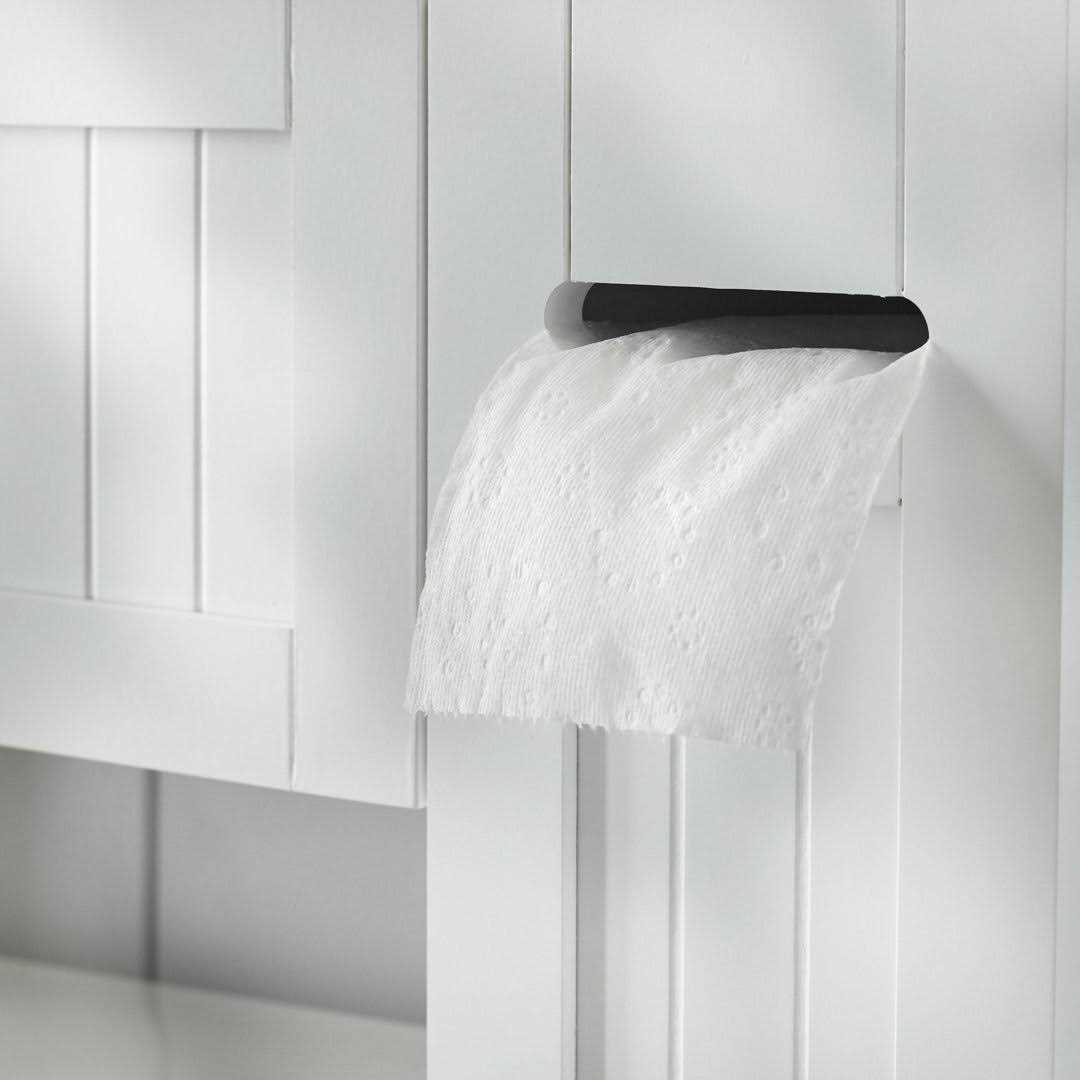 Petite powder room? Bring essential storage space without sacrificing prime real estate with this over-the-toilet storage cabinet. Built-in holders let you dispense toilet paper with ease, while the side cabinet doors conceal toiletries and other essentials stashed within. A pull-down shelf up top offers even more storage space. Assembly is required.