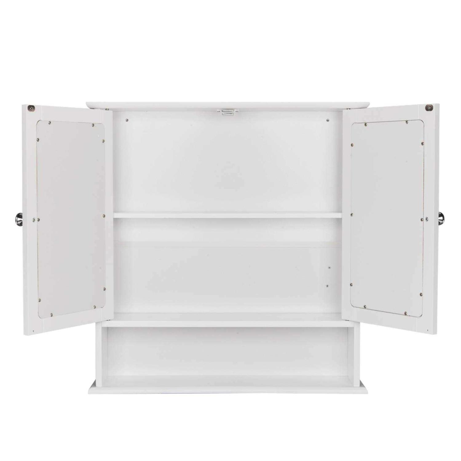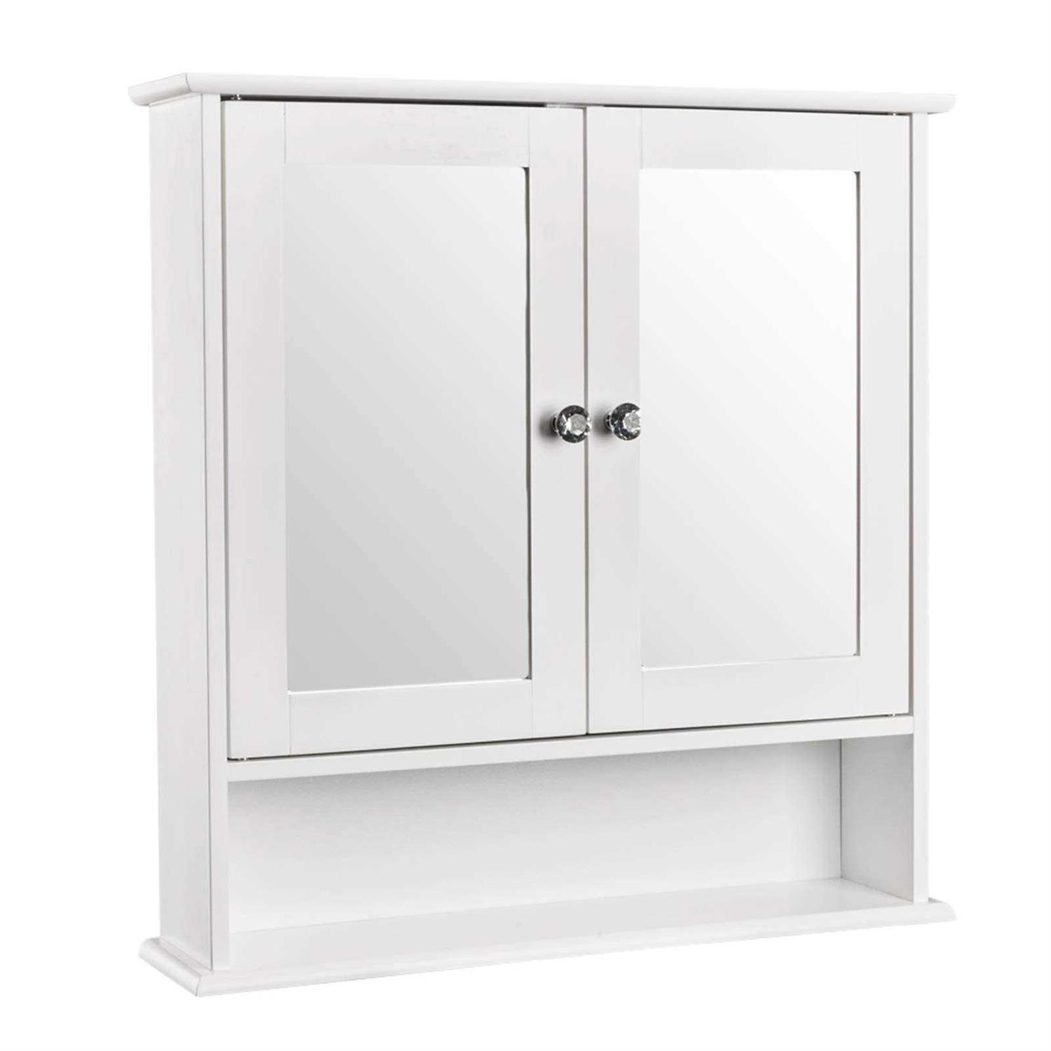 High-quality Material:The mirror bathroom storage medicine cabinet is made of high-quality MDF board, which is durable, beautiful and durable. The water-based paint spray painting process can be waterproof, making the bathroom storage wall cabinet very suitable for use in the bathroom. Adjustable Shelf Height:The minimalist style over toilet bathroom storage medicine cabinet perfectly fits the needs of life. Due to the internal shelf can be adjusted to a suitable height within 3 inches, items of different heights can be stored, such as storing sanitary products, toiletries, and sometimes medicines. Dimension about 22L*5.2W*22.8H inches (56*13*58cm). Easy to Assemble & Clean: Coming with detailed instructions and all the mounting hardware,the white bathroom mirror medicine cabinet is easy to assemble. You can complete the assembly work in a short time by following the instructions.In addition,the well painting process,making it smooth and easy to clean. It’s fantastic for the bathroom or in any other room where you require some additional storage. Adopting high quality MDF material, it features smooth, stable and sturdy. With a mirror design, it’s very convenient for use. Moreover, it’s wall-mounted, which is space saving. With high quality and fine workmanship, it’s worth buying! So don’t hesitate, just take it home! br br Features: br 1. Made of high quality material, smooth, sturdy and durable br 3. It has a long service life br 4. Wall-mounted, save space br 5. Add some additional storage for you br 6. Magnetic lock to hold doors shut br 7. Convenient for use br br Specifications: br 1. Material: MDF br 2. Color: White br 3. Dimensions: (22 x 5.1 x 22.8)” / (56 x 13 x 58)cm (L x W x H) br 4. Weight: 13.23 lbs / 6 kg br br Package Includes: br 1 x Double Mirror Bathroom Cabinet br 1 x Manual