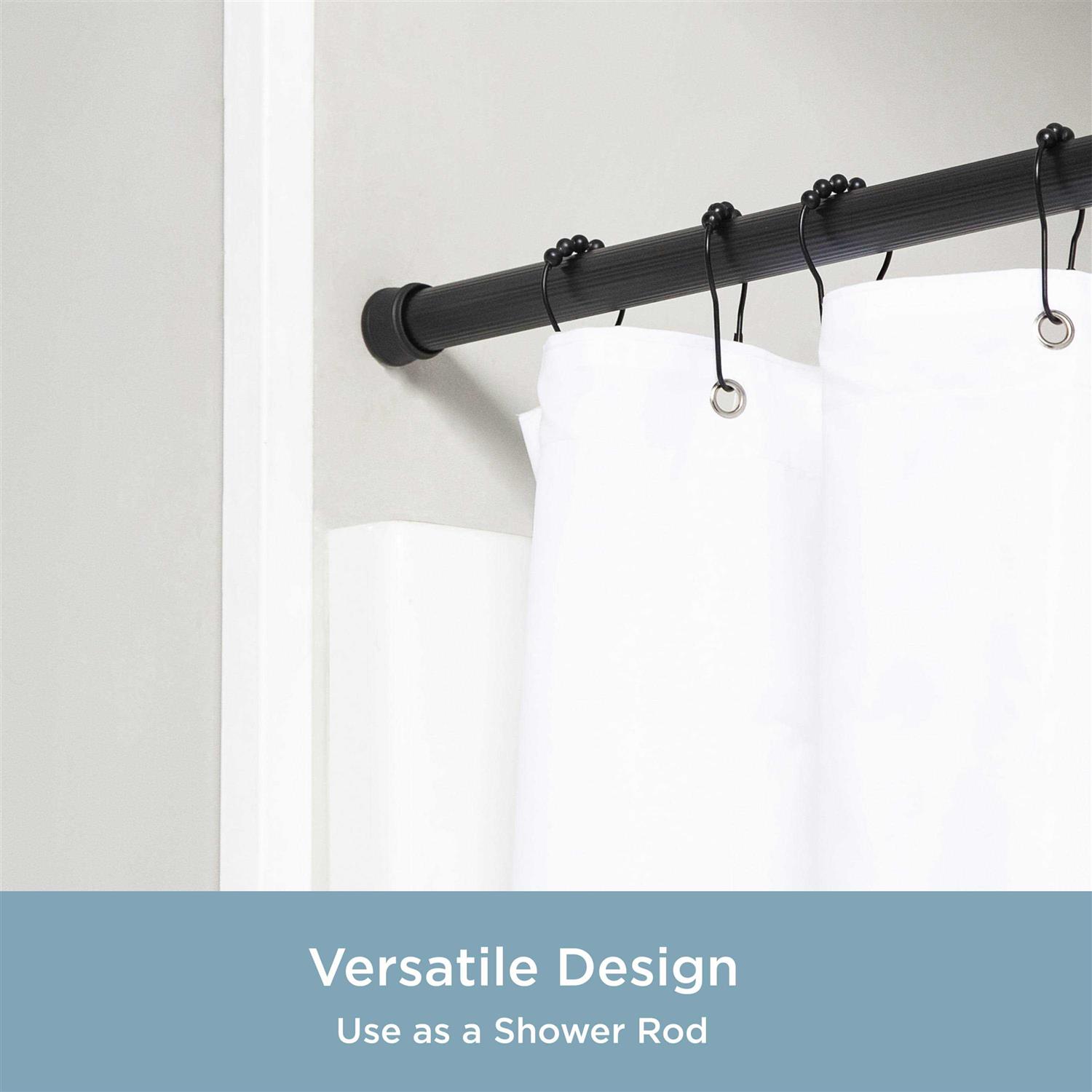 The Kenney Spring Tension Utility Rod is easy to install without tools. Use it as a shower curtain rod in standard and oversized bathtubs, or for added storage in closets, laundry rooms, and more. Made of heavy-duty steel, this utility rod is coated with a chip resistant material to prevent rust over time. The non-slip, non-scratch end caps mean no damage to your wall or tile, making this a good solution for rentals or other temporary installments. The end caps include ring locks to keep your shower curtain against the wall, preventing drafts. To install: Extend rod 1-1.5 inch beyond the width of your shower opening, then compress the ends of the rod together and release into place to secure.
