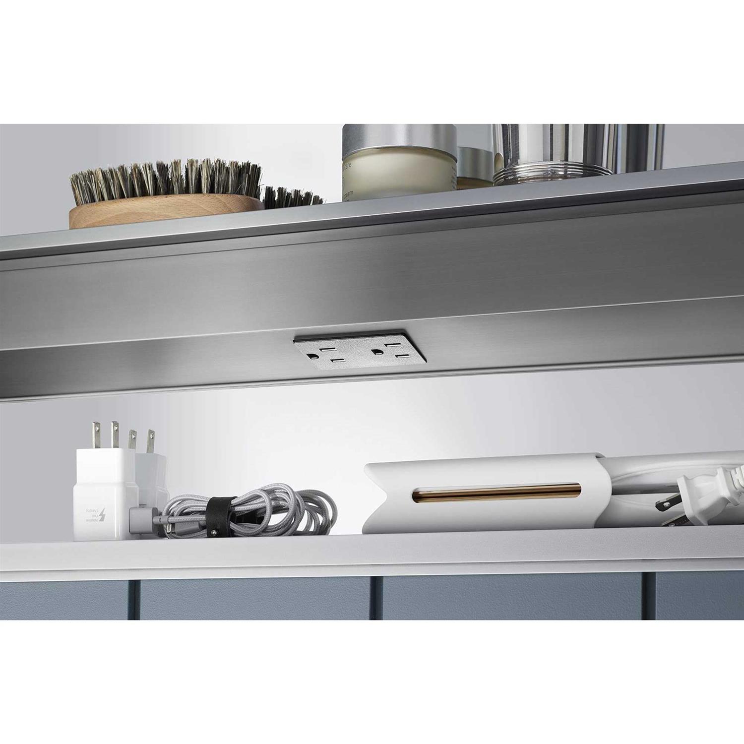 Innovate your vanity space and maximize your bathroom style and storage with the Maxstow 17-in W x 24-in Hlighted medicine cabinet, featuring exterior LED lighting, an interior electrical outlet, and the ability to attach a coordinating Moxie speaker charging dock (sold separately). Staggered shelving holds tall and short items with no wasted space, while interior-door and back-panel mirrors provide reflection whether the doors is open or closed. The slim 3½-in-deep design provides the same internal storage space as traditional 5-in-deep cabinets. Installation is fast and easy right out of the box—simply screw to the wall.