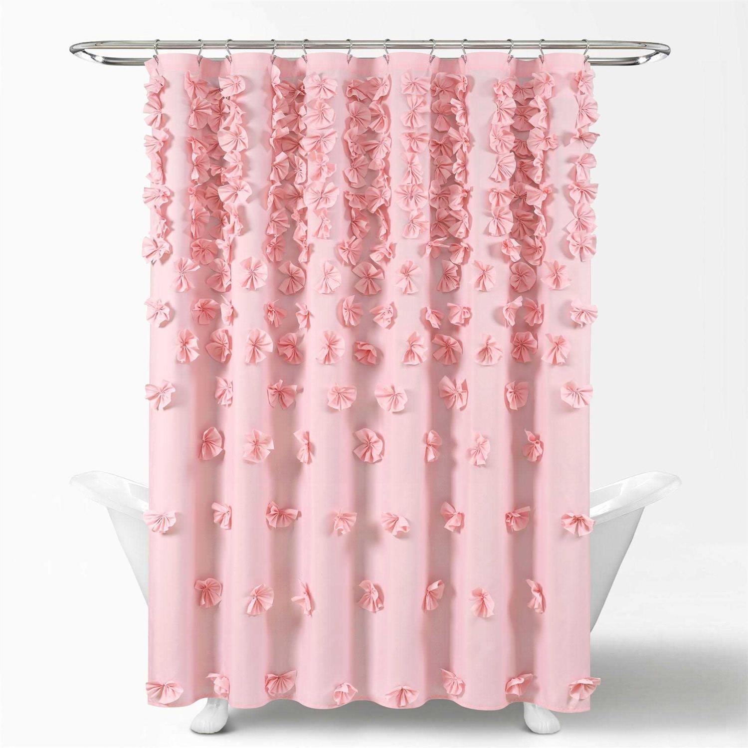 Add an elegant look to your bathroom with the Riley Shower Curtain by Lush Decor. Made of 100 percent polyester, it’s soft to the touch and works alongside a shower liner, which is available separately, to keep water spray contained. This bathroom curtain has cascades of handmade bows flowing from top to bottom of the soft brushed panel. Along the top are a dozen buttonhole openings for the attachment of shower curtain hooks or rings, which are not included. There is also a rod pocket for placing directly on the rod. The polyester shower curtain is available in a selection of colors to suit personal tastes. It coordinates with other pieces from the collection, which are each available separately, to create the total look. The size of the 72×72 shower curtain fits makes it compatible with standard-size tubs and showers.