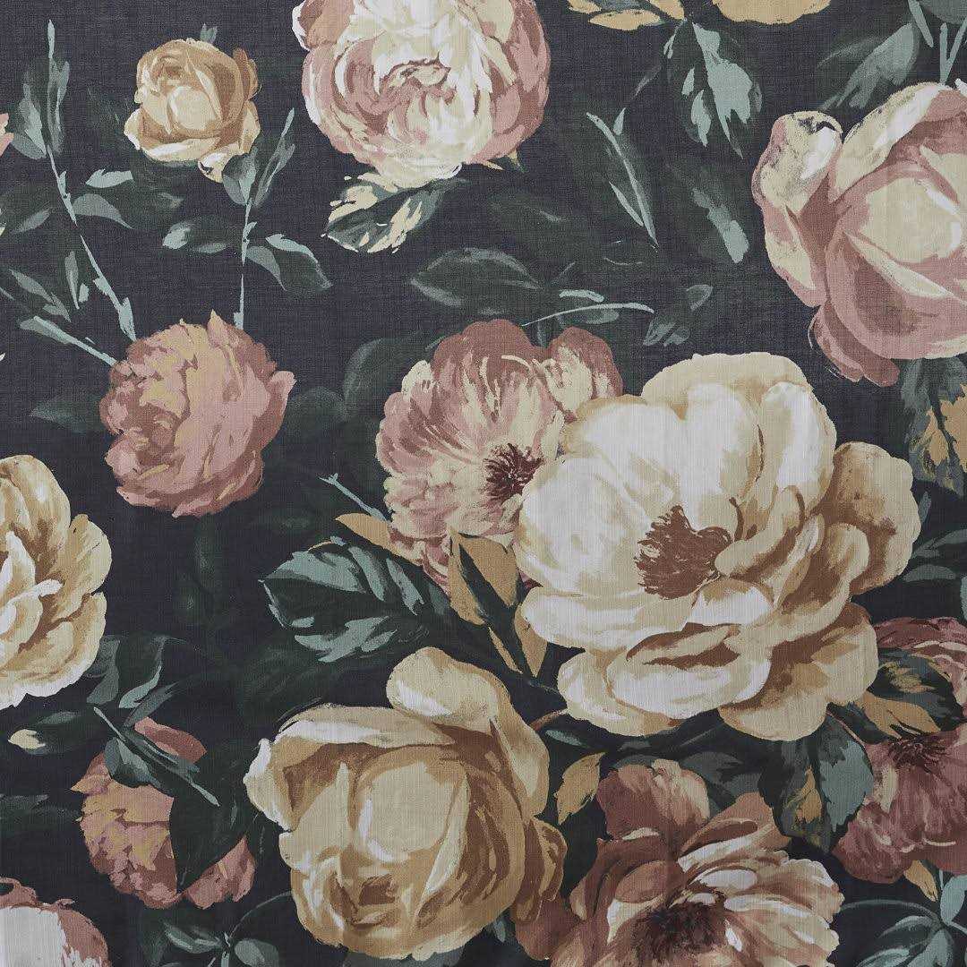 - Engineered beautiful floral print in blush, ivory, and green tones on a dark navy contrast ground.
