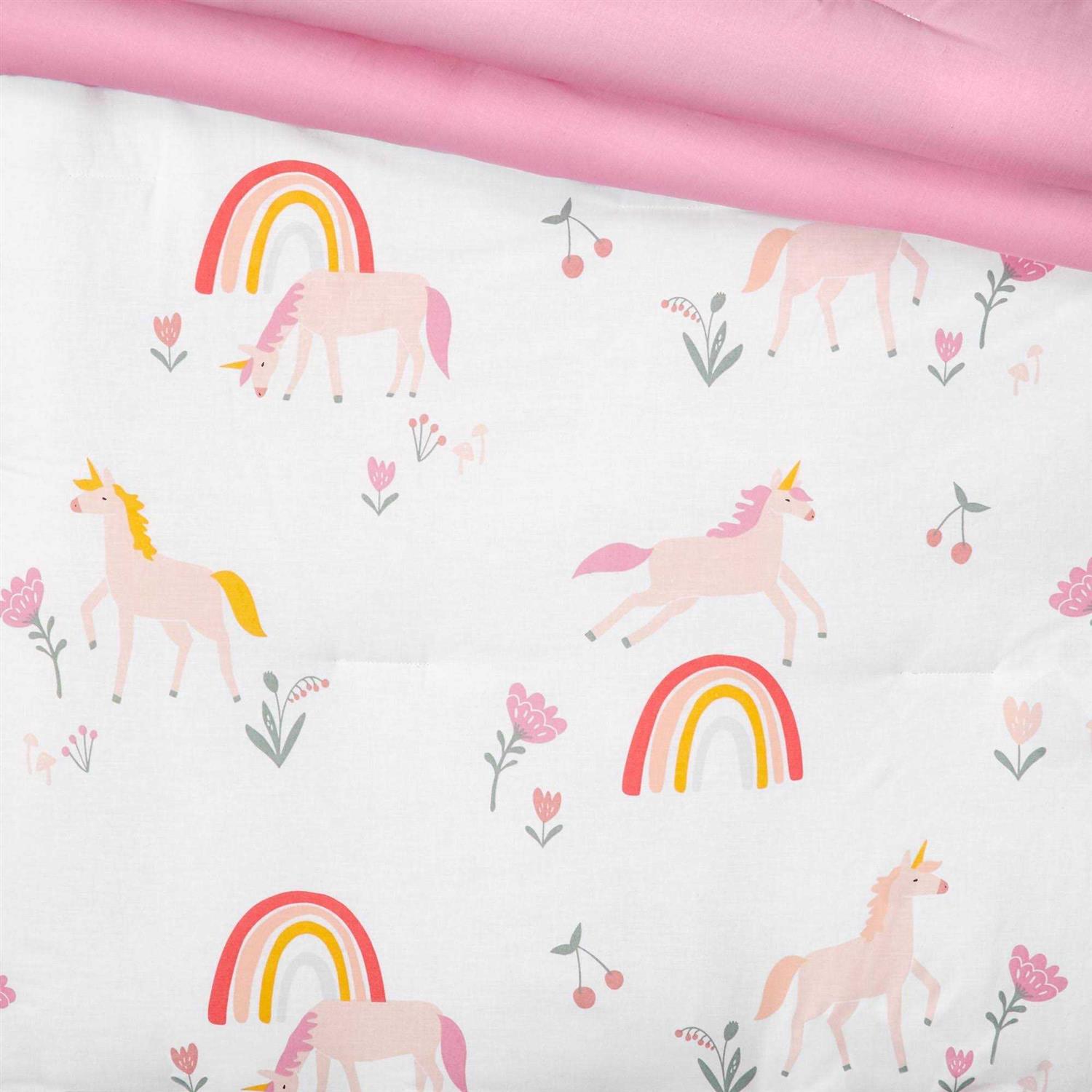 Dress your kiddo’s bed in magical style with the Unicorn Cotton Comforter Set from Pillowfort . This bedding set includes a cozy comforter and matching sham(s) for coordinated flair. Each of the pieces features a vibrant print of unicorns, rainbows, flowers and fruits against a white background to add a dash of cheerful flair to their room. 100percent cotton fabric ensures soft, comfortable year-round use, while the cozy comforter with fill adds a layer of warmth to the top of their bed. Add solid sheets and other bedding pieces to complete their bedding ensemble, and machine wash for easy care. Size: Full/Queen. Color: One Color.
