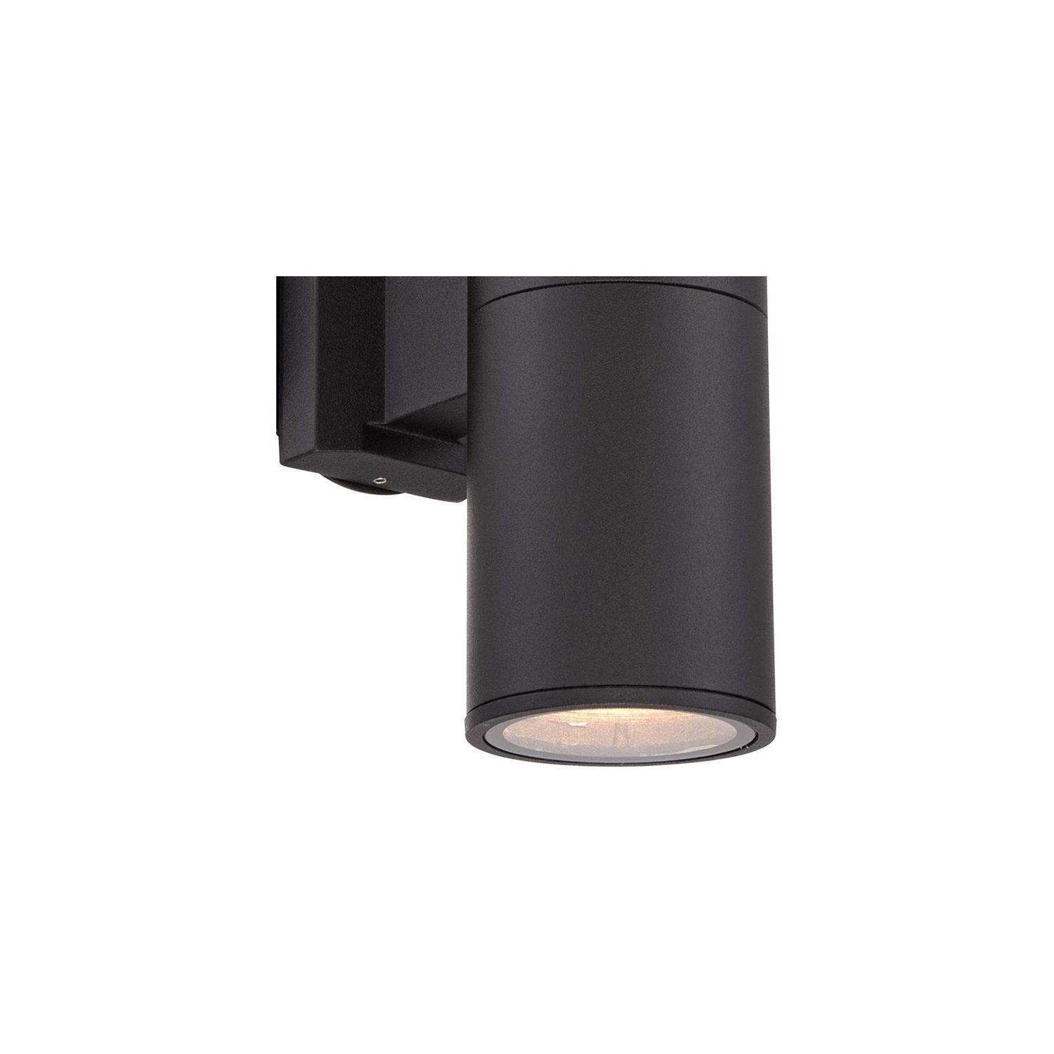 - Light is directed up and down on the wall; black finish, tempered glass lens, aluminum tube construction.