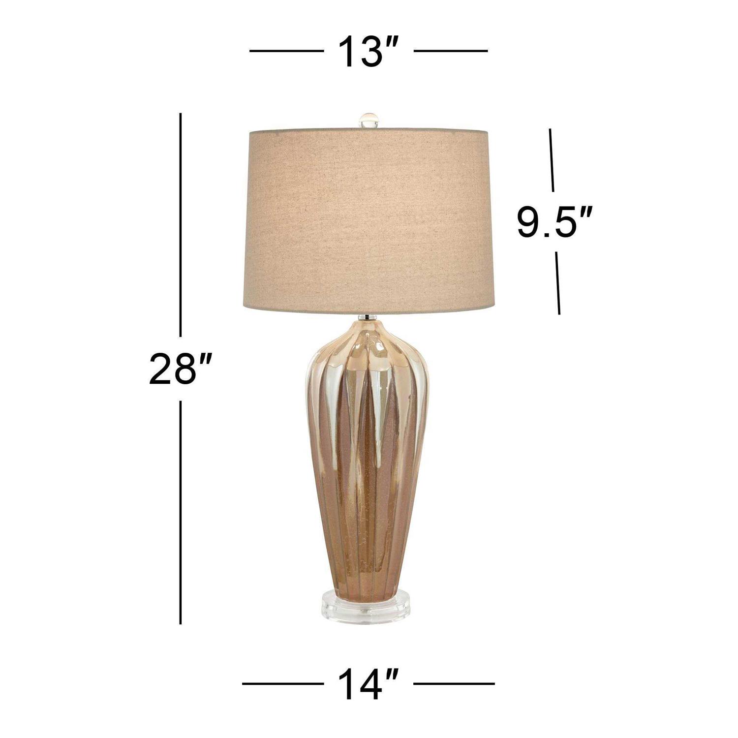 Product Details Combining a traditional material with a modern design, this tapered ceramic table lamp sits on an acrylic base and features an ivory drip finish. Additional Info: Featuring a warm earth-toned color, this tapered ceramic table lamp features an ivory drip design for a striking effect. The stylish look sits on top of a clear acrylic base for a modern touch. A drum lamp shade sits on top. Since each ceramic base is handmade, there may be slight variations in pattern and color. 28 1/4″ high overall. Shade is 13″ across the top x 14″ across the bottom x 9 1/2″ high. Weighs 6.2 lbs. Uses one maximum 150 watt standard-medium base bulb (not included). On-off socket switch. Ceramic table lamp with handcrafted details. inspired by modern, Mid-Century style. From the Possini Euro Design brand of lighting. Hand-applied ivory drip ceramic glaze. Each lamp will vary slightly in color and pattern. Round acrylic accent at the very bottom. Drum lamp shade with decorative finial on top. 8-foot long cord.