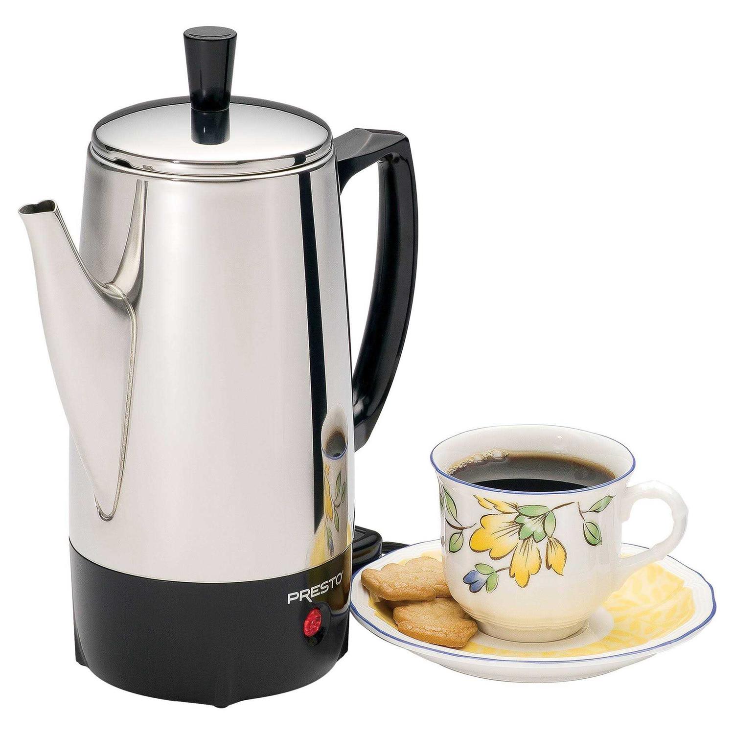 Presto Make yourself a quick cup of aromatic coffee with the Presto Stainless Steel Perk Percolator. This coffee maker is generously sized to make up to 12 cups. This coffee maker is made of premium quality stainless steel, which ensures that it is sturdy and durable. It sports a stainless steel finish that gives it a smart and compact look. This 800-watt coffee maker is shatter-proof, and resistant to rust, staining, odour, scratching, and warping, which helps extend its durability. It includes a permanent basket filter, made of stainless steel, which can be removed for easy cleaning. It features a quiet brew option for smooth and quiet operation. The complete brew indicator notifies you when the coffee is ready to be consumed. Easy to care for, the basket is dishwasher-safe while the other parts of the coffee maker can be wiped clean using a soft, dry cloth to keep it looking as good as new for years to come. It is UL listed as safe for you and your loved ones.