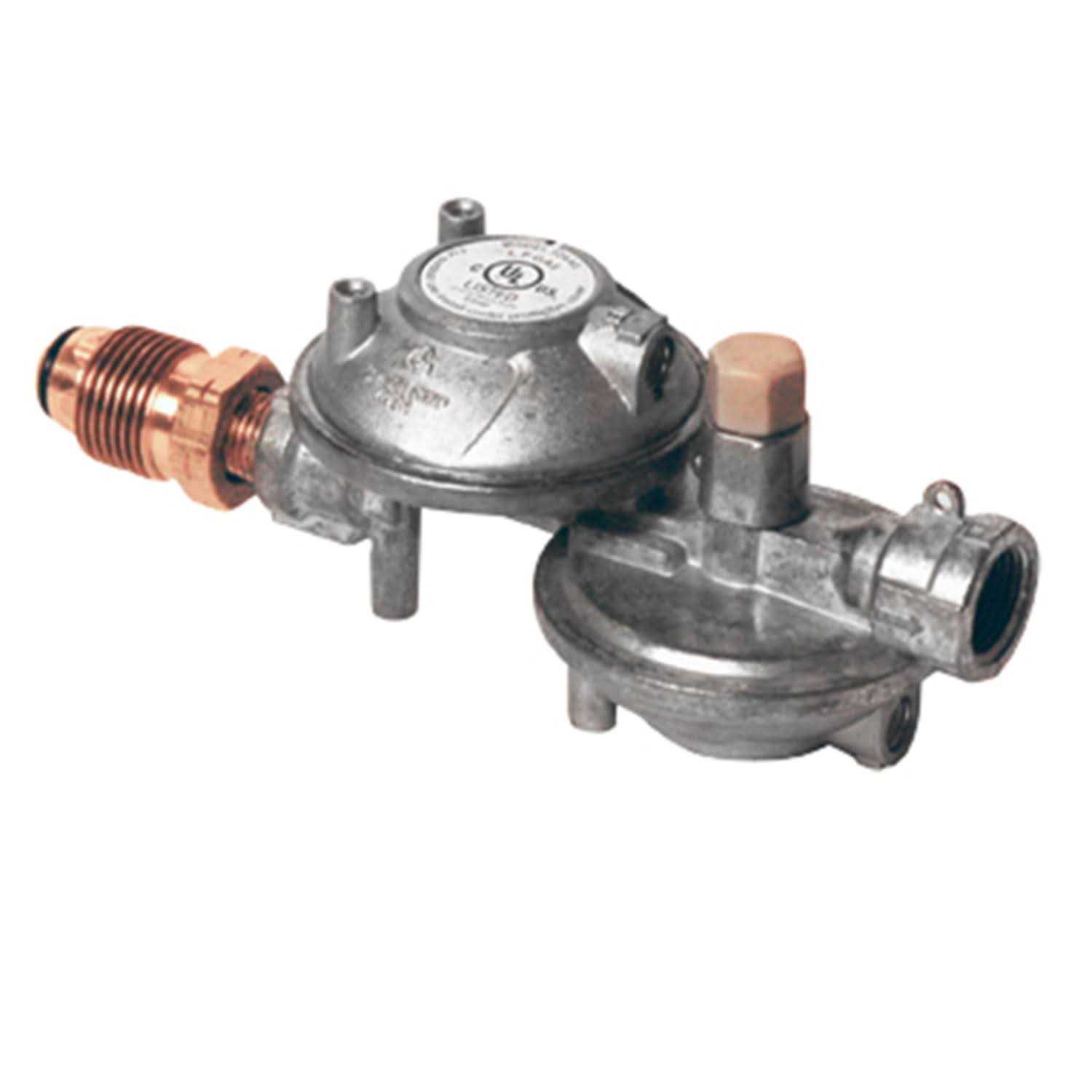 Two-stage propane regulator allows for a more consistent inlet pressure between the 1st and 2nd stage which allows for more consistent flow of gas to the appliance. Has brass nipple to open safety valve in male throwaway cylinders. Has brass nipple to open safety valve in male throwaway cylinders. Has rubber gasket for sealing.