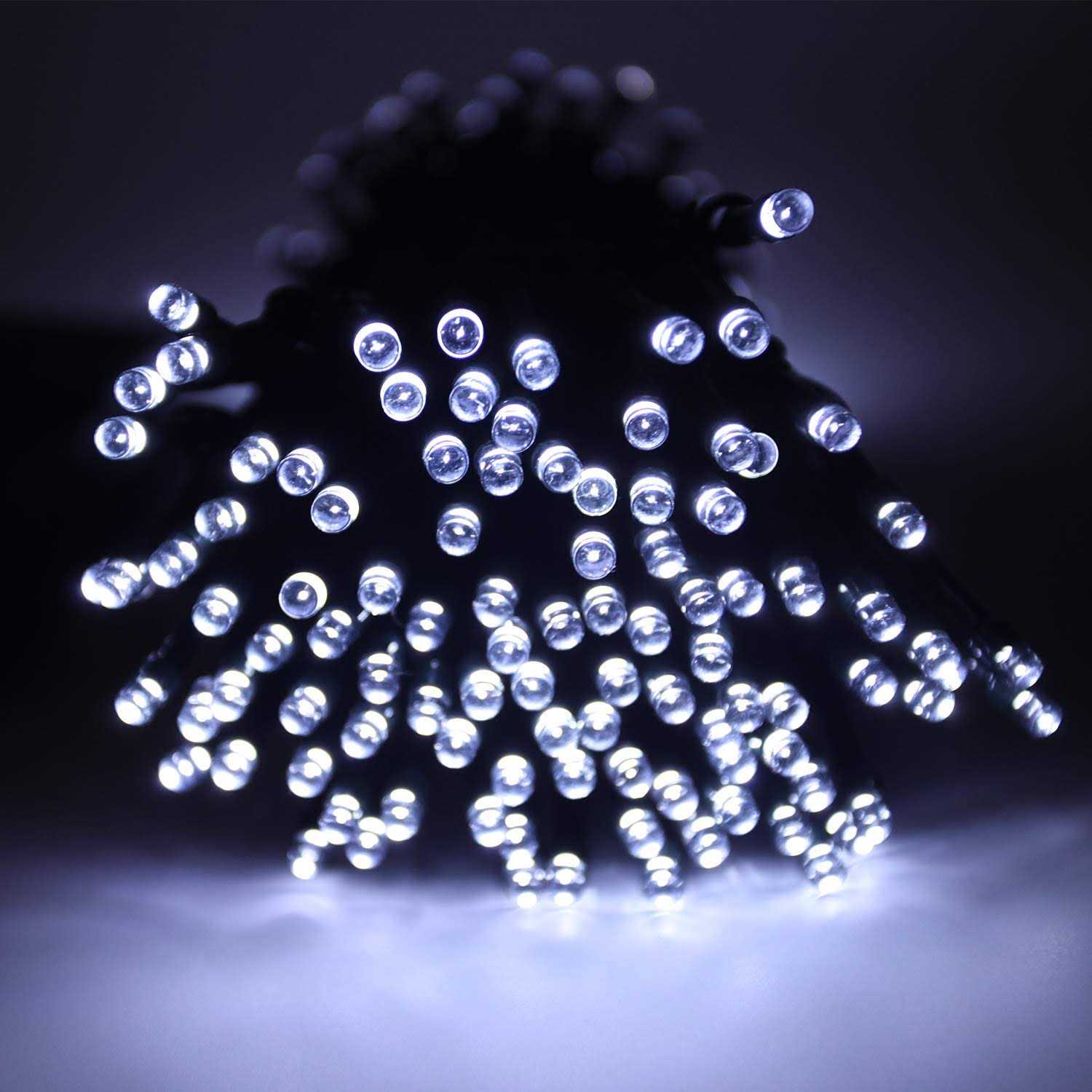 【Really Upgraded Solar Powered Outdoor Lights】: Super bright with upgraded bulbs, Longer working time with high quality 1200mah built-in battery, Higher solar energy conversion with upgraded solar panel. 【Widely Used Solar Lights Outdoor】: This starbright solar LED String lights is a great choice for Ramadan Decorations, Home Decor, Holiday Decorations, Party Decorations, Wedding Decorations, Patio, Garden, Yard, Party, Fence, Porch, Tree, Roof and so on. 【Energy-Saving & High Efficiency】: This outdoor string lights charging by solar energy, have no extra utility electric cost, and no need to replace the battery. It can work up to 8 -10 hours after being fully charged (8 hours). 【8 Modes & Memory Function】: These twinkle lights have the ON/OFF button and mode button. You can select 8 different modes to satisfy your diverse needs by pressing the mode button. And the built-in memory chip saves your last modes setting, so there is no need to reset it again. *NOTES*: 1. Please power ON first before charging, and it will be charged and light on automatically. 2. Be sure the solar panel is in a sunny location – not in a shady area – and the solar panel faces the sun. Specifications: LED Color: Cool White LED quantity: 200 LED Switch: ON/OFF, MODE (8 modes – Combination, Waves, Sequential, Slo-glo, Chasing/flash, Slow fade, Twinkle/flash, Steady on) Charging time: 8 hours Working time: 8 -10 hours Total Length: 22m/72ft Wire Length to first LED: 2m/6.5ft Space Between LEDs: 10cm/0.32ft Large Solar panel: 8.5×8.9cm (3.35”x3.5”) Battery: 1200MAH NI-MH rechargeable battery How to Use: 1. Place the LED solar string light where you want to decorate. 2. Attach the pointed ground stake to the bottom of the stake connector. Slide the solar panel box into the top of the stake connector. 3. Tighten the side screw of the stake connector to ensure the solar panel is not loose. 4. Press the ON/OFF switch to turn on the lights and choose your favorite lighting mode. Then insert the stake into the ground to complete the installation. Please cover the solar panel by your hand to check if it is at on position during day time. When it is ON, you can select your favorite mode of light. 5. Adjust the solar panel angle to ensure it will receive the uttermost sunshine.