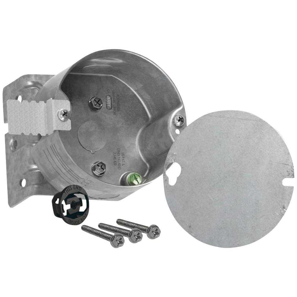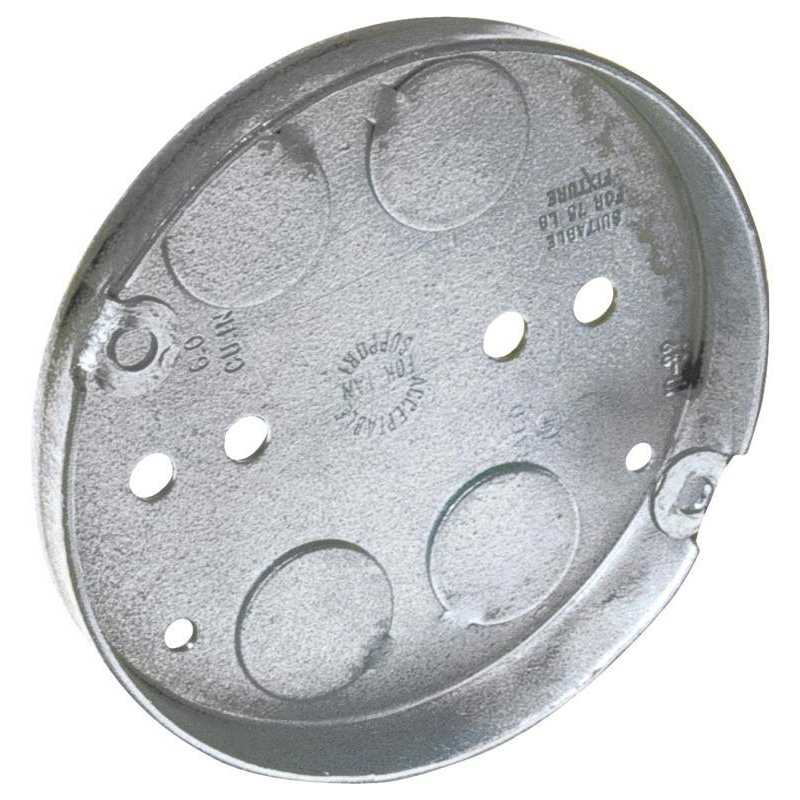 Hubbell Raco 4 inch Round ceiling fan support pan of capacity 21.5 cubic inch is used for installation of heavy light fixtures or ceiling fan. It features drawn galvanized steel construction with 1/2 inch four knockouts in bottom of pan for easy entry and exiting with cables. It measures 4 inch diameter x 2-1/8 inch It is provided with connector for use with non-metallic sheathed cable. It features hardened mounting screws for easy installation. It is acceptable for use in 2 hours rated walls and ceilings. It features 1/2 inch FA bracket that allow for easy positioning of box along wood studs or joists to be securely mounted flush. It comes with four knockouts and includes mounting hardware. It offers maximum load support of 70 lbs. for dynamic ceiling fan and 150 lbs. for static fixture. Fan support is UL listed.