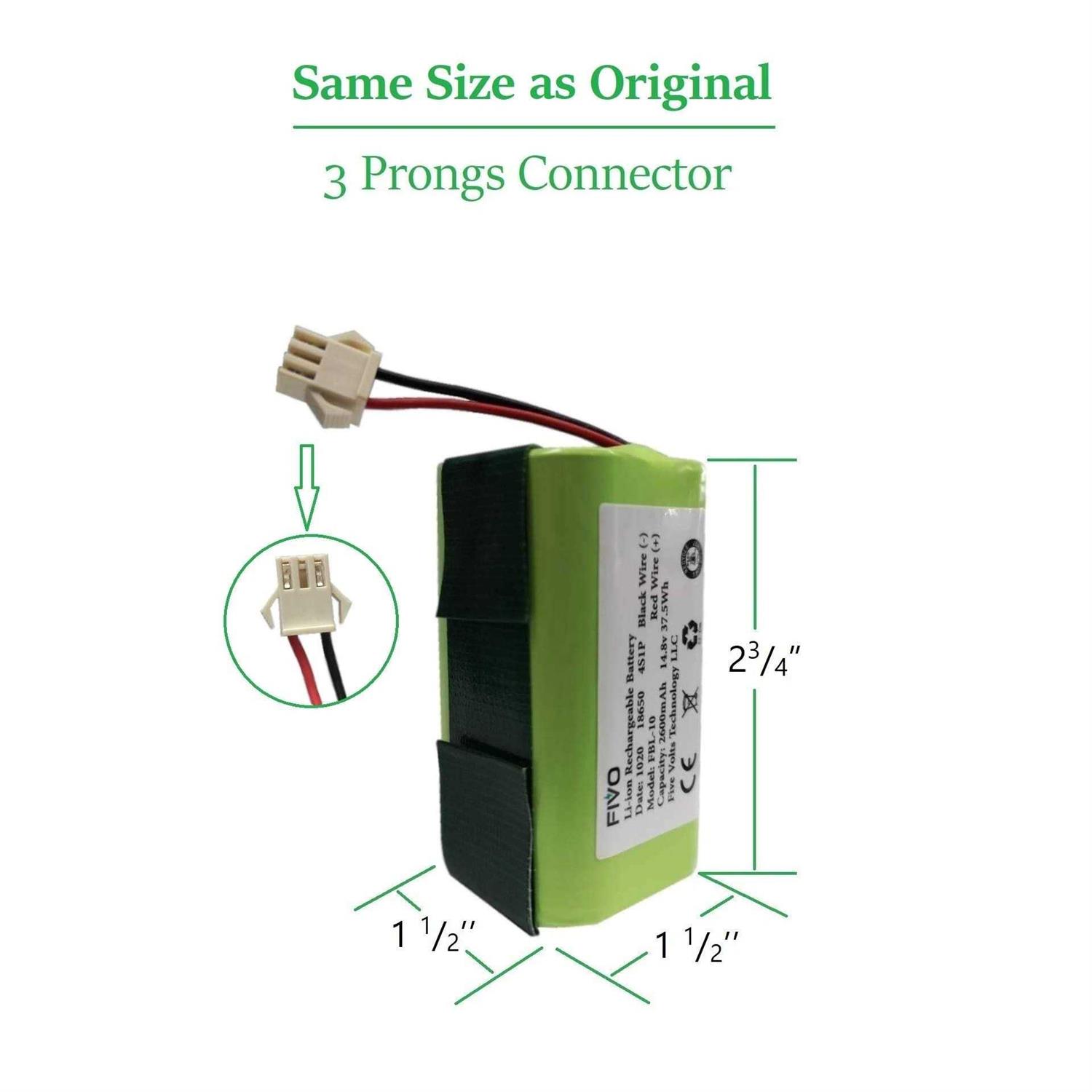 Professional Battery Management System (BMS) with provides multiple protections for over charge, over discharge, short circuit, over voltage, over-current and over heat. 14.4v 2600mAh are same with original voltage and battery capacity. 3 prongs with 2 wires and same size compare with original battery. Easy to install. If the vacuum has not been used for long time, please fully charge it at least once a month or take out the battery to avoid battery starvation. Professional Battery Management System (BMS) with provides multiple protections for over charge, over discharge, short circuit, over voltage, over-current and over heat. 14.4v 2600mAh are same with original voltage and battery capacity. 3 prongs with 2 wires and same size compare with original battery.