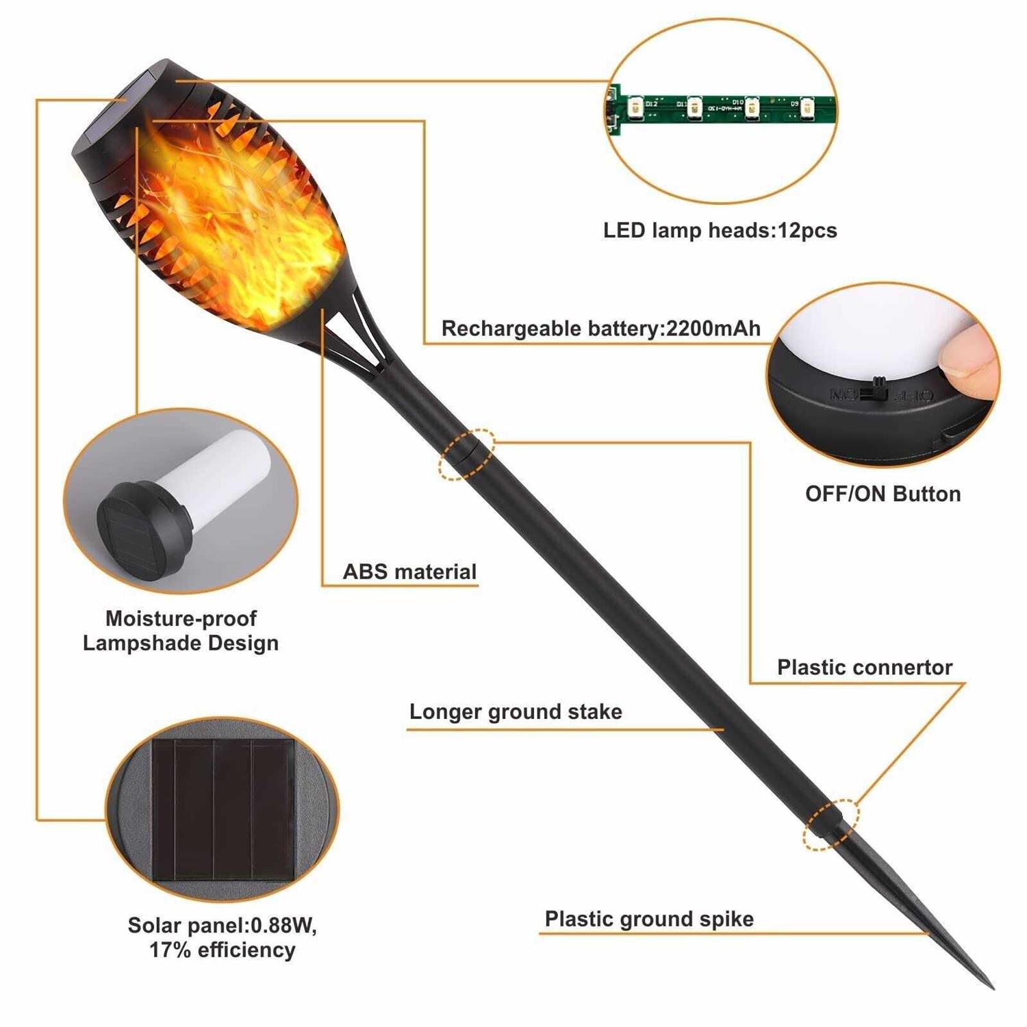 Brand: RIDALUXColor: YellowFeatures: Upgraded Lighting Design: The upgraded version of the Solar Torch Light is lighter and more convenient, solar torches lights with flickering flame provides the perfect campfire atmosphere for your yard, garden, party, BBQ and camping. Solar Powered & Auto ON/OFF: 12LED Solar Torch Lights with 400mAh Ni-MH Battery,it lights up 6-8 hours after collect solar energy all day under direct sunlight. And it turns on automatically at dusk and off at dawn. (Note: Lighting time is affected by weather) Weatherproof and Super Durable. Made of high-quality durable and IP65 waterproof ABS material,waterproof, dust-proof, and windproof to provide a warm atmosphere for your garden when charged by the sun during the day. Easy to Install: No wiring required, attach the flashlight to stakes and nails, just mount the torch solar light anywhere you like and enjoy a truly safe “flame”. When using it for the first time, turn on the switch and charge it for at least 8 hours in direct sunlight. model number: solar outdoor lights-1EAN: 0607001223683Package Dimensions: 9.2 x 8.7 x 5.2 inches