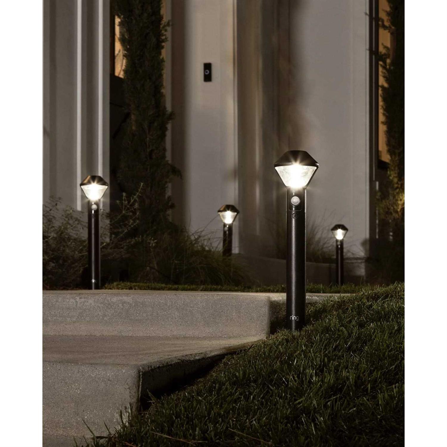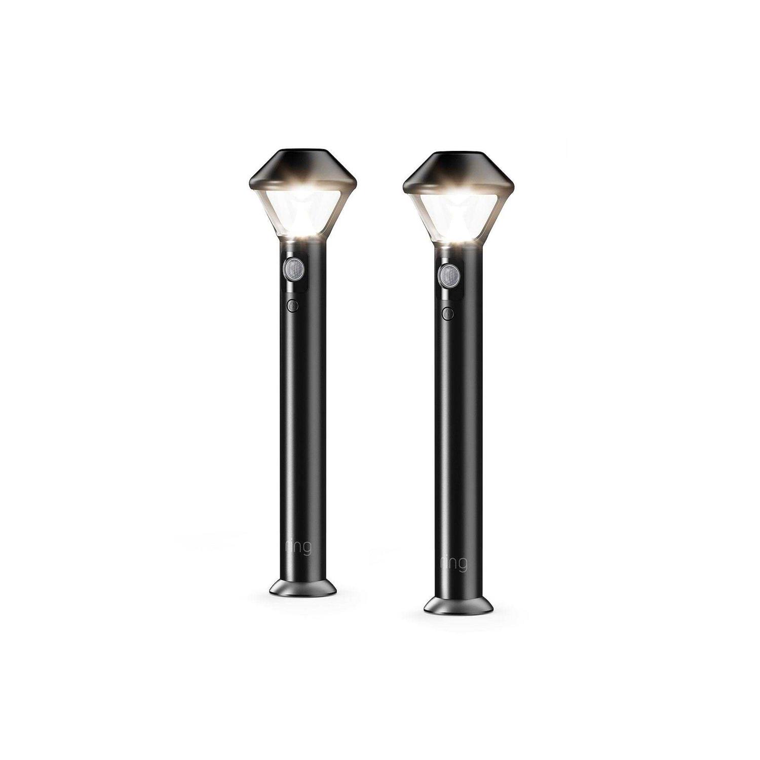 Each battery-powered path light measures 16.93 inches tall and 4.13 inches in diameter and shines 80 Lumens of brightness on pathways and other areas when motion is detected. This Starter Kit includes one Ring Bridge to place indoors so you can get notifications, customize settings, and connect to other Ring devices – all from the Ring app. Path lights install in minutes with a wire-free design to illuminate your pathway, entryway, or sidewalk. Group Ring Smart Lights together to brighten up a small area or make your whole yard shine whenever one light detects motion. Connect with Ring doorbells and cameras to create a fully connected home security system. Works with Alexa when connected to the Ring Bridge to turn on lights and adjust brightness with your voice.