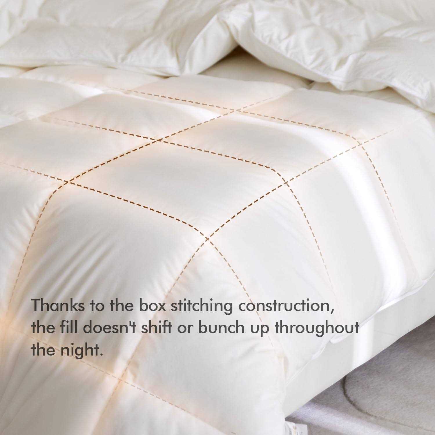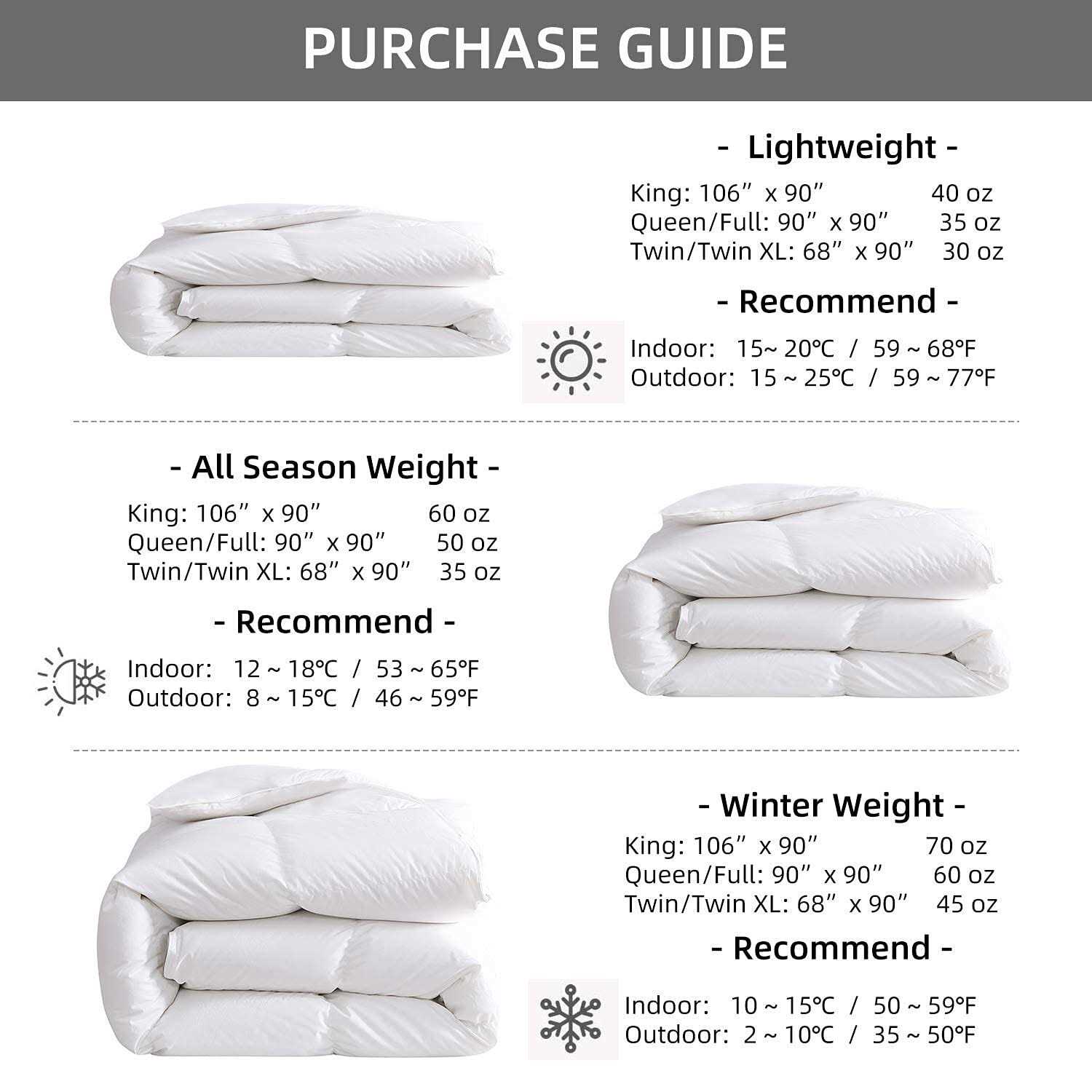 Winter weight for Extra-warm — Large filling that the winter king size can reach 70 oz fill weight, for those who like it extra cozy, this comforter is luxurious and fit for snuggling. Available in your choice of King size 106″ x 90″, Queen size 90″ x 90″ and Twin size 68″ x 90″. 100% Egyptian Cotton — Comforter cover is made of 100% Egyptian Cotton, safety certified by OEKO-TEX Standard 100, ultra-soft, breathable and quiet. The special design of box-stitch quilting keeps the filling in place and avoid any leaking during the night ensuring a stable sleep. You can buy with confidence! Upon receipt, remove them from their packaging, fluff gently, and allow several hours to recover their full loft. Machine wash cold. Gentle cycle, and separately. If there is no free movement in the washer or dryer, use large capacity commercial washer/dryer. If for any reason in the first 30 days you are unsatisfied with quality of the item with LABELS received, you can return it in exchange for New.