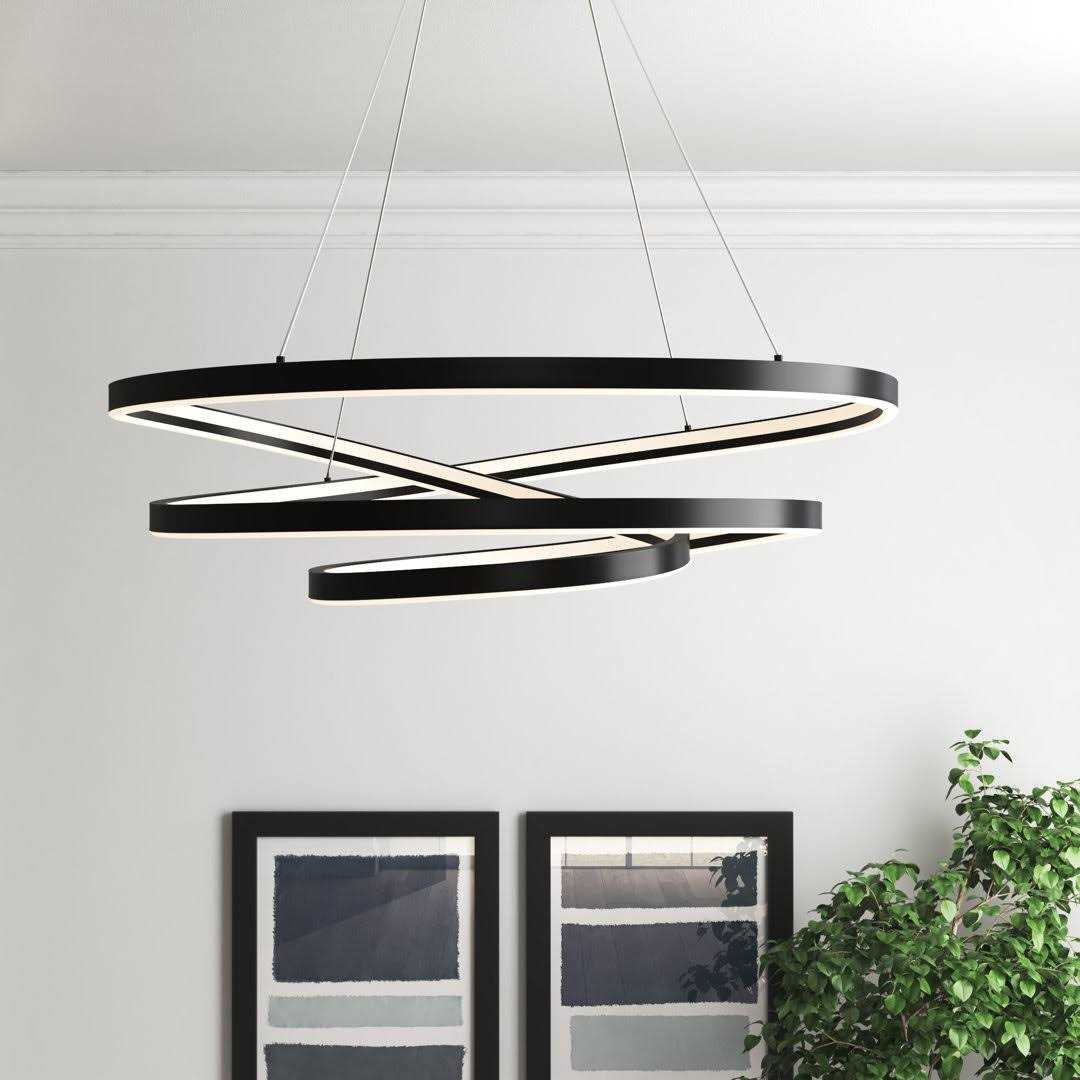 This chandelier makes a statement wherever you place it in your home thanks to its ultramodern sculptural silhouette. Its geometric metal frame spirals and twists to create three separate tiers that boast a sleek neutral finish. A single LED bulb is built on the side of the structure, and it’s dimmable to move you effortlessly from day to night. It hangs with the help of four height-adjustable wires and a round canopy that’s compatible with sloped ceilings. Measuring 44.5″ wide, this chandelier is a standout addition to living rooms and grand entryways.