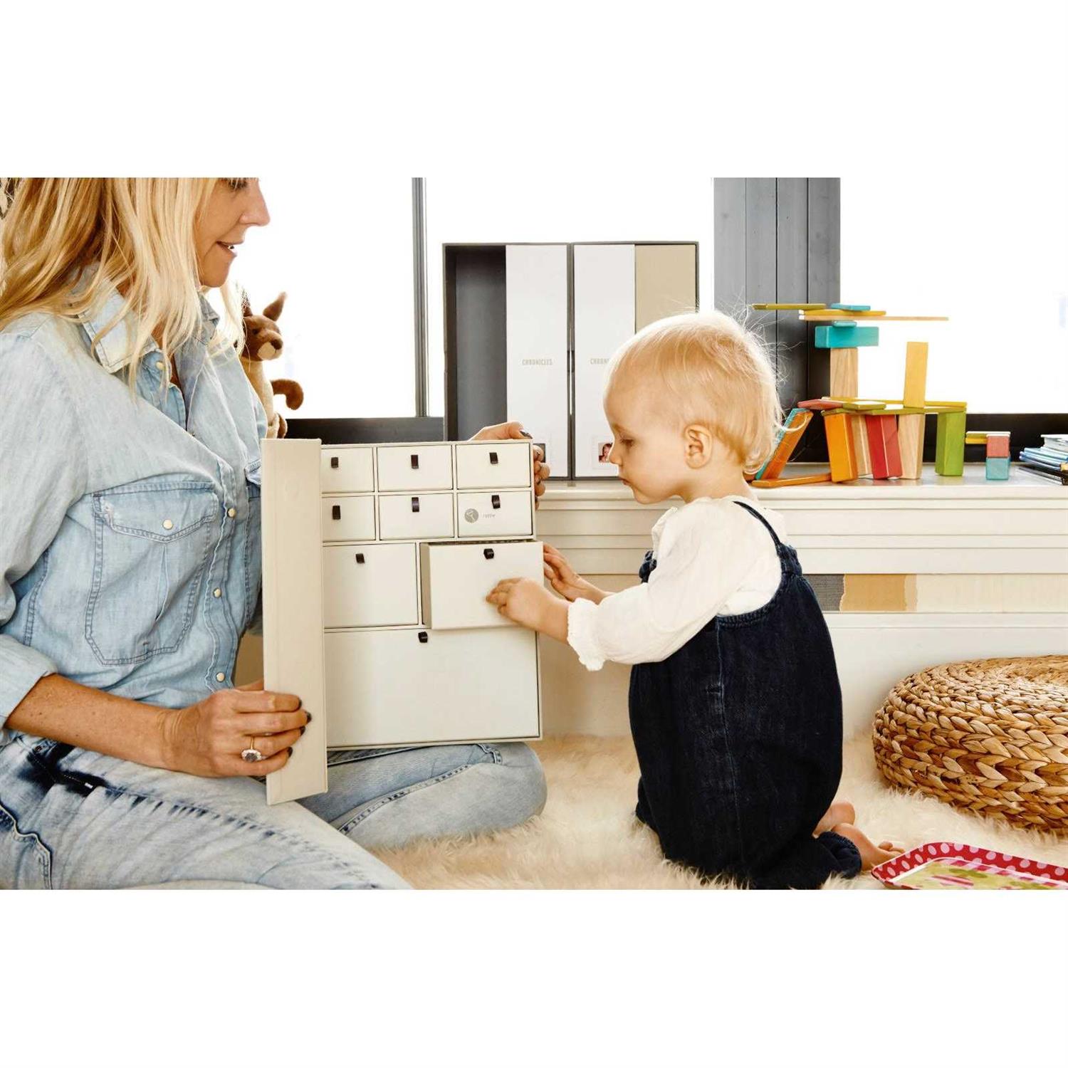 The Holiday or Christmas Gift shell Love! A bespoke and super easy system to organize, enjoy, and store your most important childhood memories. Our thoughtfully designed personalized boxes include every detail to make sorting all your keepsakes – from the blankie that comforted her to the first lost tooth – a snap. Acid-free drawers, vertical files for documents, even mini envelopes for that first lock of hair or first tooth, and illustrated labels help you organize and then find these cherished items. The sturdy, fabric-covered boxes of The Library are meant to be displayed like beautiful books and passed on proudly to the next generation, more fitting than that old shoe box. Mom has given you so many memories, celebrate them with her this Mothers Day.