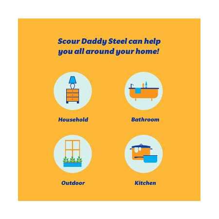 Tear through tough messes like carbonized stains and grease build-up. Stainless steel fibers are woven into the mesh outer of these commercial grade grime-fighters. Scour Daddy Steel resists rust and odours and features a FlexTexture foam core. Not for use delicate/coated surfaces. Scour Daddy Steel is a stainless steel scouring pad that is thicker, stronger and more absorbent than other scour pads! Scour Daddy Steel is 32% thicker, 65% stronger and absorbs 64% more water than competing scour pads thanks to two exclusive materials. Scrub Daddy’s unique FlexTexture foam on the inside keeps him sturdy and changes texture based on the temperature of your water: firm in cold water to better remove stubborn debris and soft in warm water for easier jobs.
