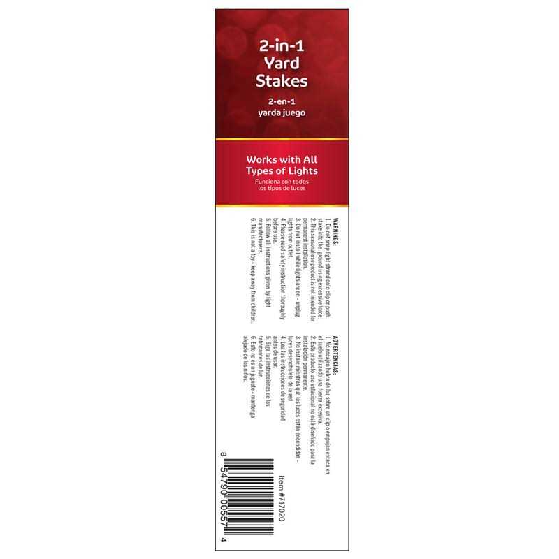 Add a festive touch to your yard with these 2-in-1 Yard Stakes. These yard stakes are perfect for the holiday season and can be used to decorate both indoor and outdoor spaces. The green color and plastic material make it easy to match with any decor. The lights are perfect for creating a warm and inviting atmosphere. Clean with a damp cloth for easy care. No additional parts required. Made in China.