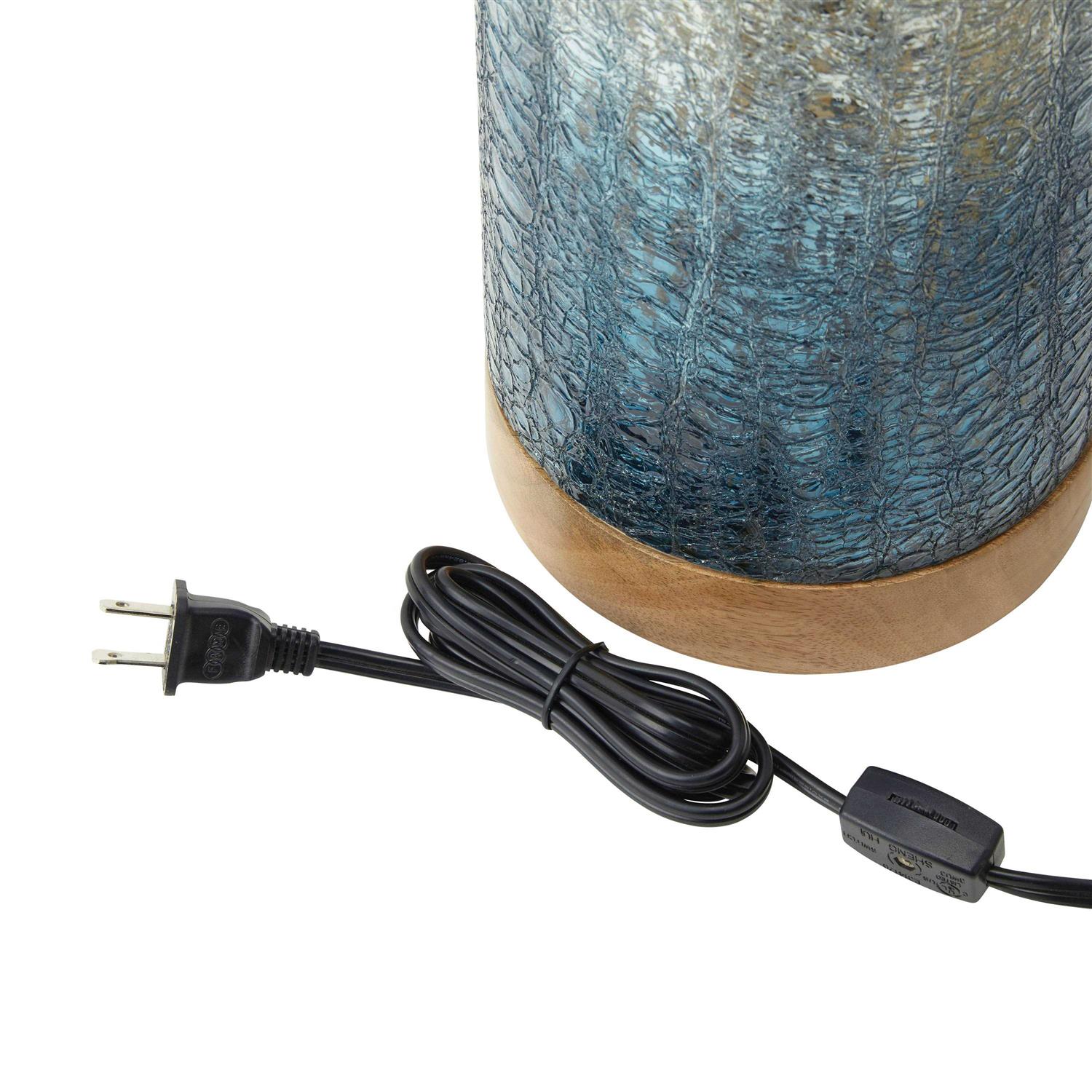 Overall dimensions of 6.0in L x 6.0in W x 11.5in H Novelty accent lamp Blue and silver ombre glass shade Brown base made of mango wood Requires one 40W Type A bulb (not included) Add light and style to any room with this 11.5″ H 1-Light Glass and Wood Accent Lamp from River of Goods. This novelty accent lamp features a cylindrical glass shade with a blue and silver textured ombre-effect for a modern vibe and a brown mango wood block base in a natural finish. Great for placing on the sideboard, console or side table in your living room, bedroom or entryway, this accent lamp requires one 40-watt Type A bulb (not included) for a cool accent that will brighten your space.