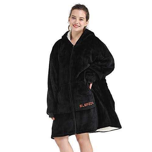 Feels like a portable electric blanket u2014 Immerse yourself in the luxurious comfort of a Slepzon blanket hoodie this season. Lined with both polyester sherpa and microfiber, experience the delicate fabric against your skin as you keep yourself nice and toasty One size fits all u2014 The magic of the oversized blanket sweatshirt is that one size will fit most people. From adults, toddlers, men, and women – as long as it fits, you can enjoy the benefits of lounging around the home in a hoodie that feels like youu2019re wrapped in a cloud Convenient u2014 From the deep pockets (perfect for storing your phone, snacks, remote, etc) to the quality front zip to better control your temperature, our wearable blanket is designed with your preferences in mind. You can even pull it on and off like a traditional jumper The perfect loungewear u2014 Cover yourself with comfort as you relax around your home. Tuck your legs into the blanket sweater to feel like a cocoon as you enjoy the TV or curl up in your bed as you read your new book with a mug of hot chocolate at your side Winterproof u2014Not just limited to indoors, you can take your oversized hoodie blanket out into the wild too.