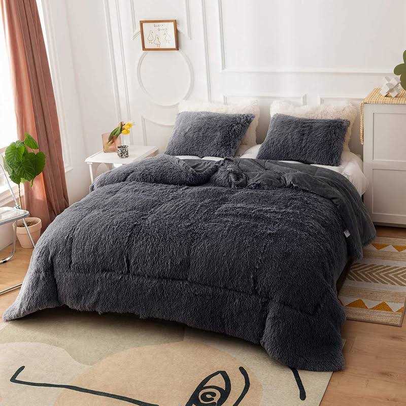 SUPER SOFT AND FLUFFY: This is a double-sided fluffy comforter set. The front of the dark grey plush comforter is cozy faux fur plush and the reverse is smooth comfortable crystal velvet. QUEEN SIZE: 1 dark grey faux fur comforter (with insert) 90inch X 90inch; 2 furry pillowcases 20inch X 26inch. WARM AND COMFORT: fluffy comforter set queen make you warm and cozy during the cold weather. Meanwhile, this queen plush bed set is light enough that you don’t overheat. Dark grey faux fur bedding set offers warmth, comfort, and chic contemporary update to any dormitory, bedroom. ALL-SEASON: This dark grey faux fluffy shaggy comforter gives you the most comfortable feel when you are about to fall asleep or rest in the cold winter. You can also use it as a blanket to protect against excessive air-conditioning in the summer. MACHINE WASHABLE: Please gentle cycle with washing bag separately in cold water. Maybe shed a little when opening. It’s not a problem after wash. p Color: Dark Grey | Size: Queen br br Description: br 1. Fabric: 100% premium faux fur & crystal velvet. Breathable soft reversible dark grey faux fur comforter set queen keeps your body warm all night long for sound sleep. br 2. Stitching Technique: plush comforter set queen is highly durable with high tensile strength, making it strong and less likely to rip or tear. br br Specification: br Queen Size br 1 X Comforter: 90″ x 90″ br 2 X Pillowcases: 20″ x 26″ br br Package included: br 1x fuzzy Comforter set br 2x Pillowcases(without insert) br br Note: br 1. Please allow 1-3cm difference due to manual measurement . br 2. Please note that slight color difference should be acceptable due to the light and screen. /p