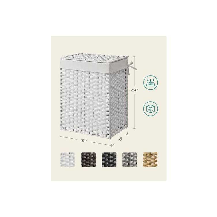 SONGMICS Handwoven Laundry Hamper, 23.8 Gal (90L) Synthetic Rattan Clothes Laundry Basket with Lid and Handles, Foldable, Removable Liner Bag, White