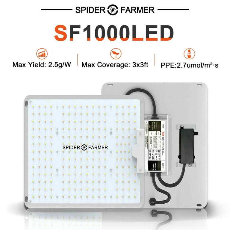 Top Features 2022 VERSION LOWER RUNNING COSTS & HIGHER-QUALITY YIELDS: SF1000 LED grow lights utilize the latest in high yielding LEDs technology today-Samsung LM301B diodes, high energy efficiency with 2.5 umol/J, delivers powerful light output and uniform canopy penetration to resulting maximum higher yields. Only consumes 100w, running 50% less power than the HPS or other SMD LEDs or Blurple lamps. Veg footprint is 3 x 3 ft, Flowering footprint is 2 x 2 ft. NEW DIODE LAYOUT & DIMMING DESIGN: Newest upgraded SF1000 growing lights, the diodes arrangement gathered at the edge makes the PPFD more uniform, absorb light better, produce higher yields. The dimming knob be adjusted the light intensity at liberty. Multi-light Connection with unified dimming especially beneficial for large area of indoor growing and commercial planting. IDEAL FOR ALL GROWTH STAGES: Excellent full spectrum- white, blue, red and IR (3000K, 5000K, 660nm and IR 760nm, IR is dimmer than other red diodes.You can wear glasses to see it ). 3000K providing more reddish light and the 5000K providing more blueish. The 660nm red and IR light is especially useful during bloom, where it speeds up flowering time and boost yields. Uniformly across the surface and deep into the roots and bottom of canopy for consistent, highest quality flowers. WELL MADE & SOLID CONSTRUCTION: No Fan Noise Free. High Efficient, reliable and detachable SPIDER FARMER Brand Driver have great dissipate heat. Aluminum heat sink is thick and sturdy, protective covers for cables; User-Friendly Packaging. Quality components mean the light lasts longer, SF Light takes good cares of you with more considerate design, you can easily save money without purchasing lights frequently. As a professional manufacturer of Led grow lights for more than 10 years. Spider Farmer has always insisted on creating more efficient, suitable and high-quality home planting equipment for plant growth, and strives to become a trusted partner for every grower! You will get a Spider Famer SF1000 grow light, instruction manual, a pair of silver hooks, a pair of black hangers. Package includes: 1 x SF1000 LED Grow Light 2 x Stainless Steel Hanger Hook 2 x Adjustable Rope Hanger 1 x User Manual for Installation 1 x? 2 meters Power Cord(US, UK, AU, EU plug Automatically send by region)? Warm Tips:1. Do NOT touch while in operation.2. To prevent eye damage, avoid looking directly at the LEDs.3. In summer or other hot environments, please use a cooling fan to keep a suitable temperature for your plants. Specification SF1000 Spectrum 660nm,3000K,5000K,760nm IR LED 218 pcs SAMSUNG LM301B PPF 250.43umol/S PPE 2.5 umol/J Power draw 100W? 5%@AC120V-277V Coverage Max Coverage:3x3ft Core Coverage:2x2ft Lumen 16439Lm? 5%@AC120V 16327Lm? 5%@AC240V 16292Lm? 5%@AC277V Light Size 325*290*59MM Package Size 385*350*125MM Gross Weight 1.92KG DB 0dB Input Voltage AC100-277V Amp 0.8274A@AC120V? 0.4246A@AC240V? 0.3739A@AC277V Operating Temperature -20-35? Frequency 50-60HZ HPS/MH Replace<