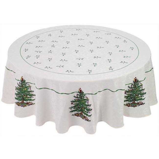 The new Spode Christmas Tree 50″ x 70″ Tablecoth by Avanti features the iconic Christmas tree design border with tossed holly leaves and a green ribbon border. Printed on a 58percent cotton/42percent polyester jacquard woven cloth. Imported.