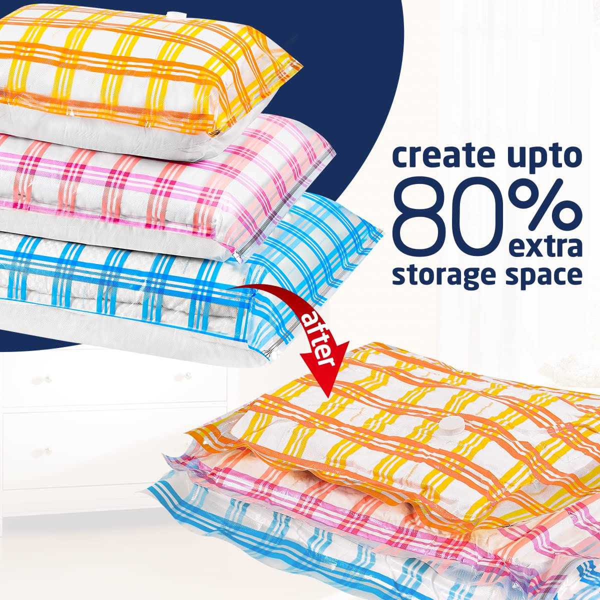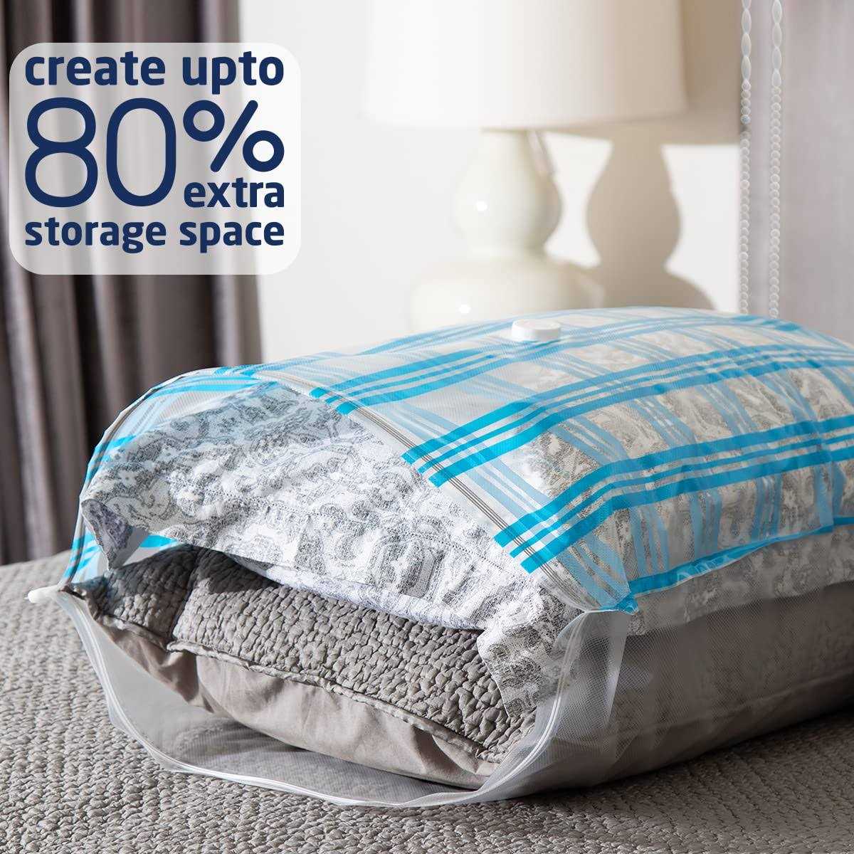 Vacuum Storage Bags offer a perfect storage solution for clothes, with which you can put away your seasonal clothes, comforters and blankets, pillows and more. Easily create 80% more space! Durable Space Saver Bags: extra flexible and thick premium PA&PE (30% thicker than other brands) make these bags ultra durable and re-usable. Secure Vacuum Sealer Bags for clothes: these vacumestoragebags with advanced double-zip and triple-seal valve design to every bit of air out and nothing back in. Convenient Space Bags: compatible with any standard vacuum cleaner hose for quick vacuum. A small-sized hand pump is also included, perfect for travel.