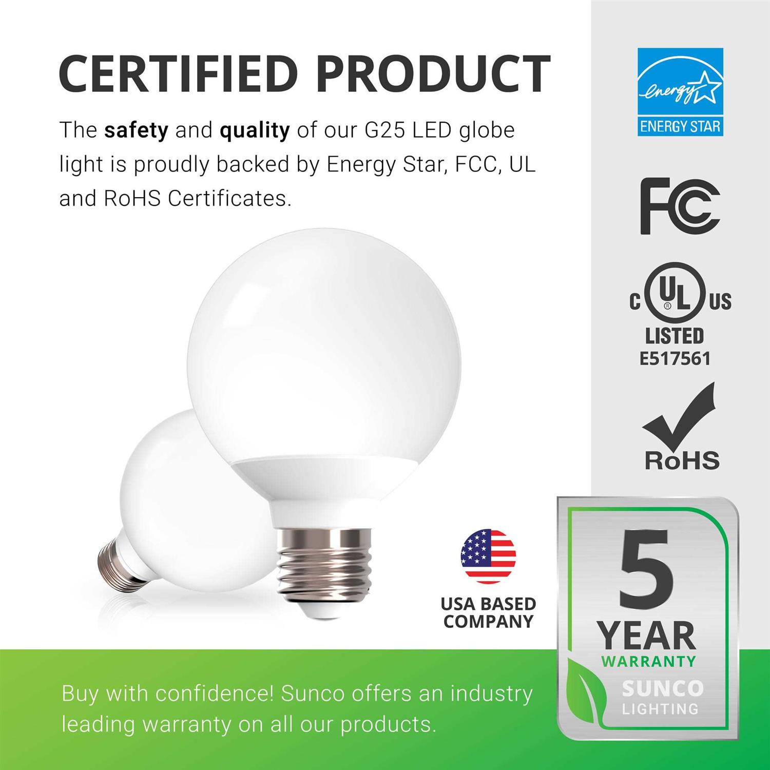 Top Rated Dimmable G25 LED Globe Light Bulb with E26 Edison Screw Base DIMMABLE – Seamless dimming capabilities (10%-100%) to suit any mood or decor. Our G25 LED globes offer sunlight-like quality for true color rendering. Ideal applications include vanities, chandeliers, pendant ceiling fixtures in bathrooms, kitchens or any room in your home. Also great for theatrical makeup mirrors, hair salons, and barbershops. SAVE ENERGY – Lower your energy consumption instantly (up to 85%) by converting to LED! Sunco’s LEDs are a sustainable choice by offering a longer lifetime than traditional bulbs (halogen, incandescent, fluorescent) to reduce maintenance. Our G25 LED bulbs provide instant start up with no warm up. They have no buzzing or flickering for maximum eye comfort.