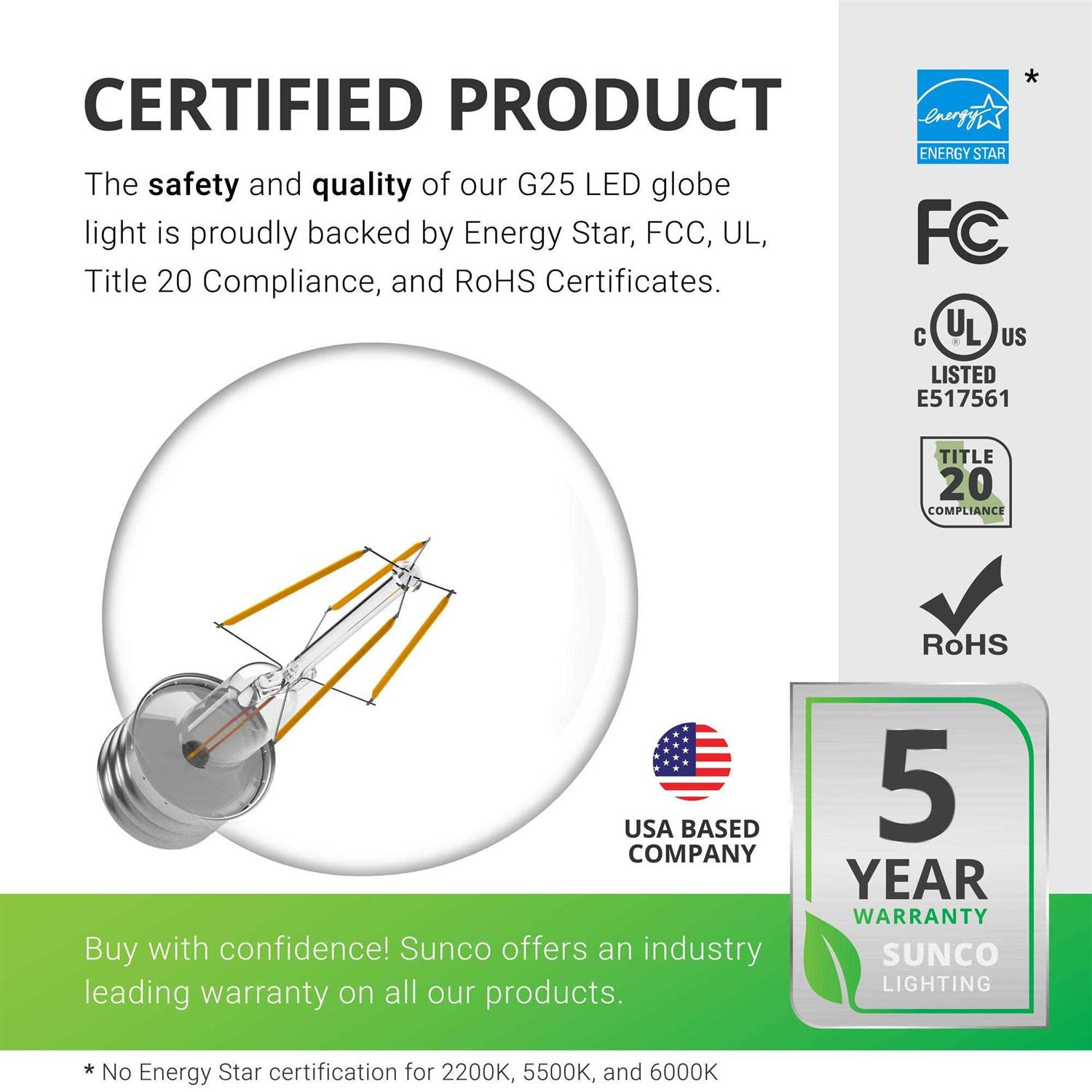 Sunco 10-Pack G25 LED Bulb, Filament, 500 Lumens, 5000K Pack / 10-Pack