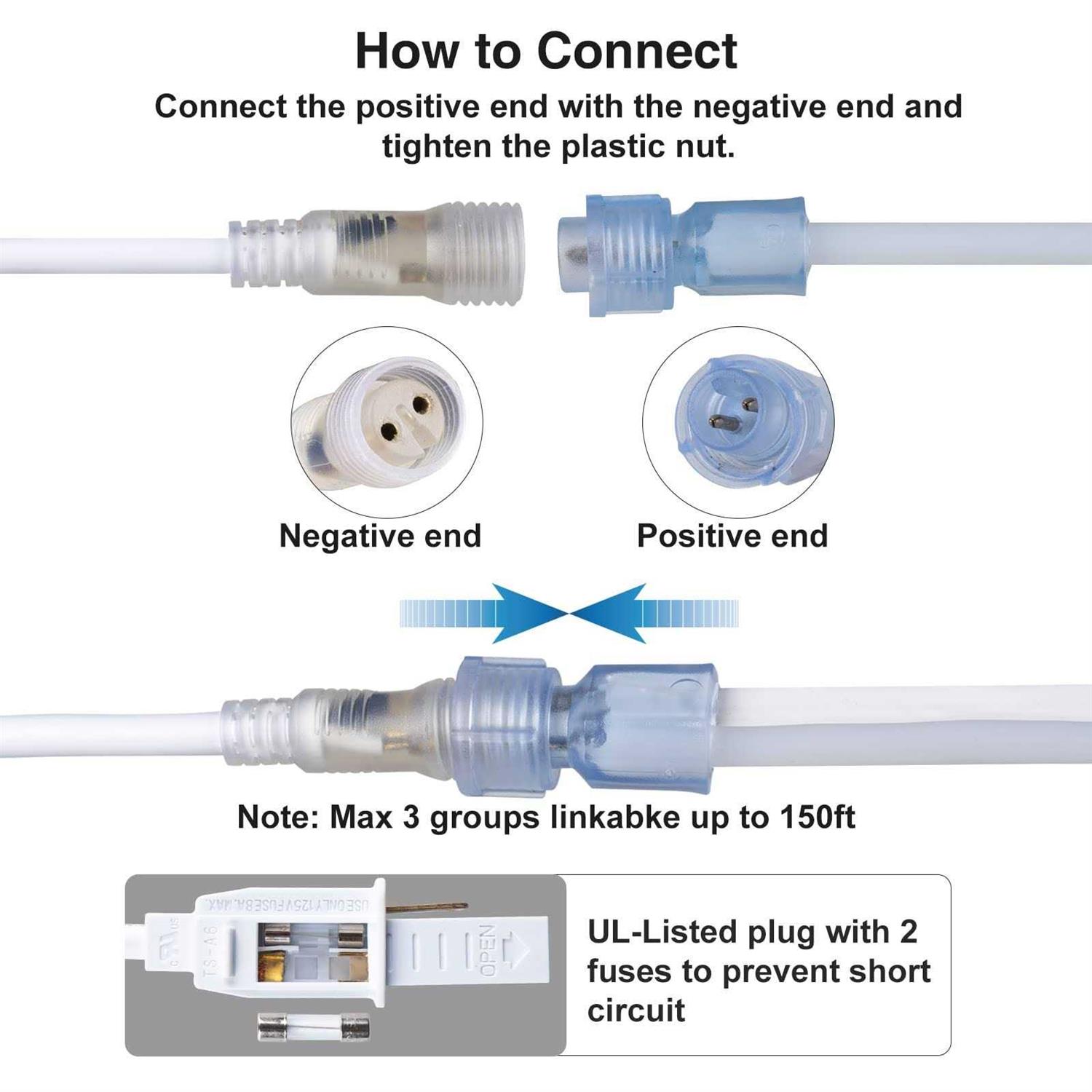 Connectable : The neon rope lights, with the help of connector, can be connected to up to 150ft. Our neon lights come with two power plugs in the package.If the power supply is damaged, it can be replaced at any time.( Note:This neon rope light cant be cut.) | Safety & Durable : The power plug is UL listed. Built-in fuse design for increased safety and reliability. This neon rope lights has a service life of more than 5,000 hours. Note: The adapter is not waterproof.The plug need further waterproof when used outdoors. | Flexible & Waterproof : The neon rope lights outdoor is flexible to perfectly fit the space being decorated. But DO NOT stretch or twist the LED rope light as this will damage it.IP65 waterproof coating makes this rope light the best choice for both indoor and outdoor decoration. | Widely Use : The led neon rope light is ideal for living room, kitchen, under cabinet, dining room, bedroom, upstairs, party decoration, stairway, wedding, advertising signs, letter sign, display signage, outlines, Thanksgiving, Christmas, New Year decor and more.