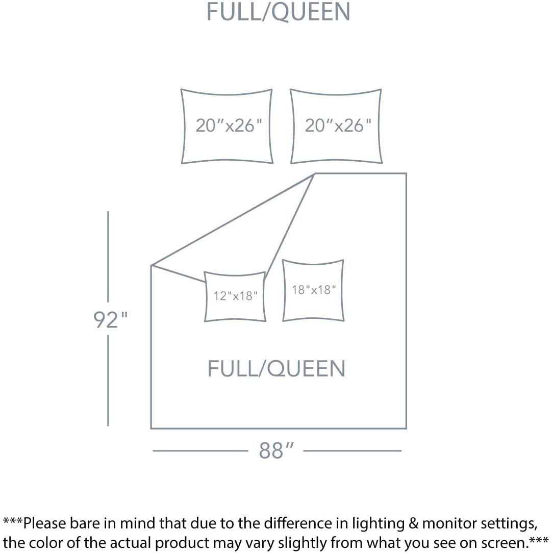 Full/Queen Set includes 5 pieces: One comforter 88”x92″, two standard shams 20”x26″, two decorative pillows 12”x18″, 18”x18″. WHAT’S INSIDE