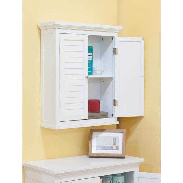The wall cabinet has an elegant crown molded top piece with two decorative louvered doors. It adds ample storage with style to your bathroom. The decorative louvered doors keep your toiletries hidden and provide privacy. It is also very functional with one adjustable interior shelf. It also features chrome finished knobs for easy opening . This cabinet comes with assembly hardware. – Features:Finish: white – Includes hardware, 2 shutter doors, and 1 adjustable interior shelf – Made of MDFChrome oval-shaped door knobs – Crown molded top – Decorative louvered doors – Surface mount – Door magnet and hinges are pre-hung – Specifications:Overall Dimensions: 24″ H x 20″ W x 7″ DShelf Dimension: 17″ W x 5″ DInner Dimension: 21″ H.