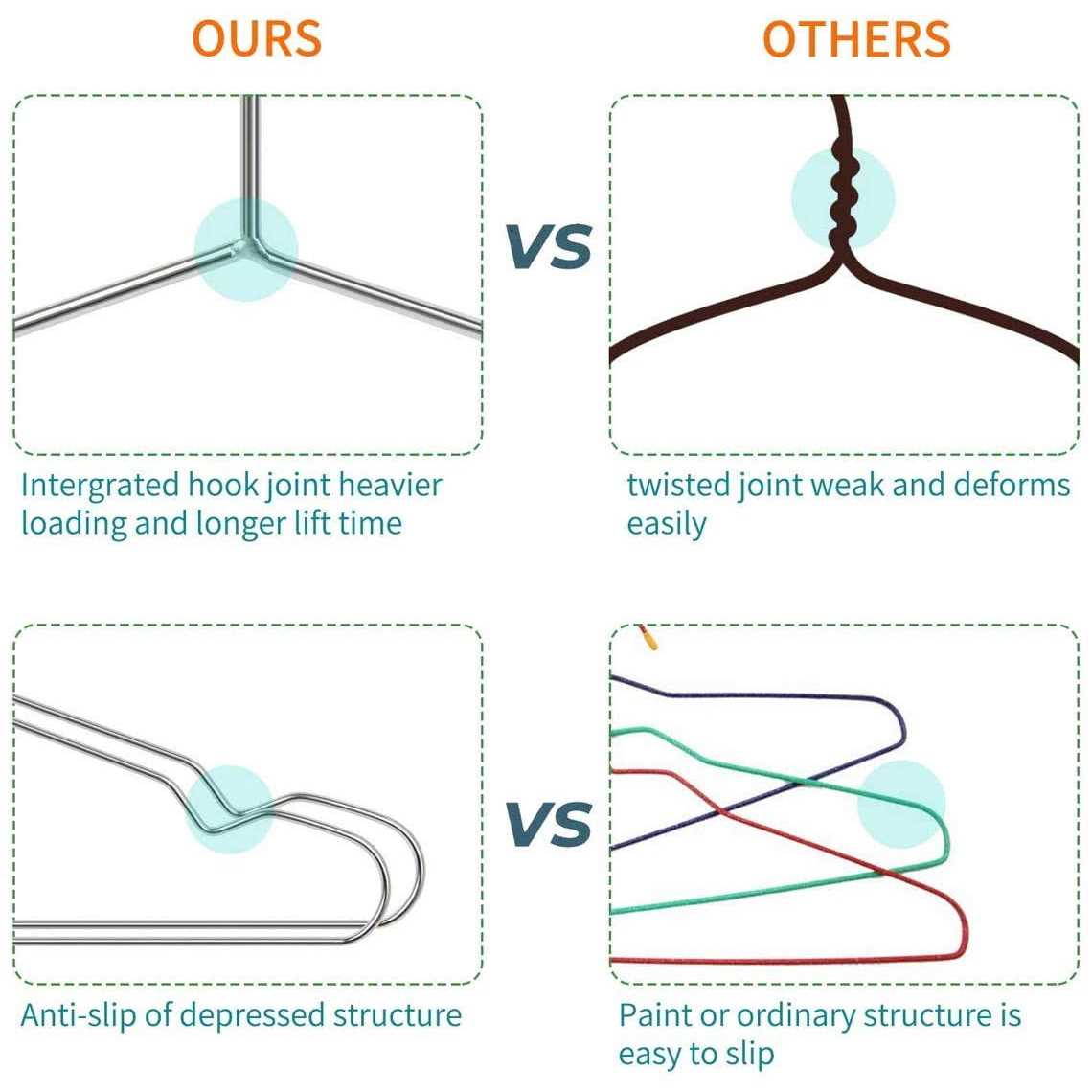 Heavy Duty: The non slip heavy duty hangers are stronger than other hangers, far from rust and more durable than plastic hangers or wooden hangers. These clothes hangers will not decay due to moisture or easily break due to heavy clothes. – Color: silver hangers – *Hook radians:Clothes hanger appropriate hook radians design for all standard clothes rods – *Not hurting the hand design ,The hanger the tail end is in the shape of a ball, there is no sharp edge design – *Perfect connection:The connection adopts superb welding technology – * Non slip shoulder groove :The groove design let the clothes is not easy to fall – *Smooth surface:Metal wire surface smooth,without breaking garment – *compared to wooden the metal hangers are more durable and water proof.
