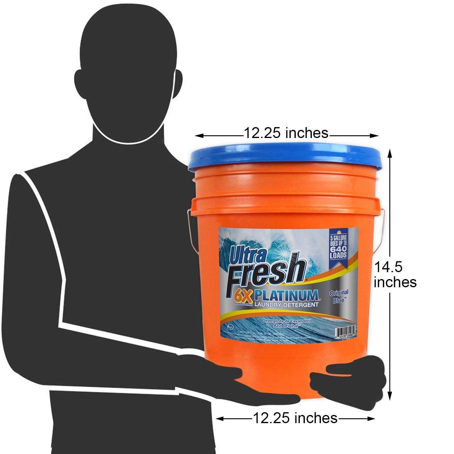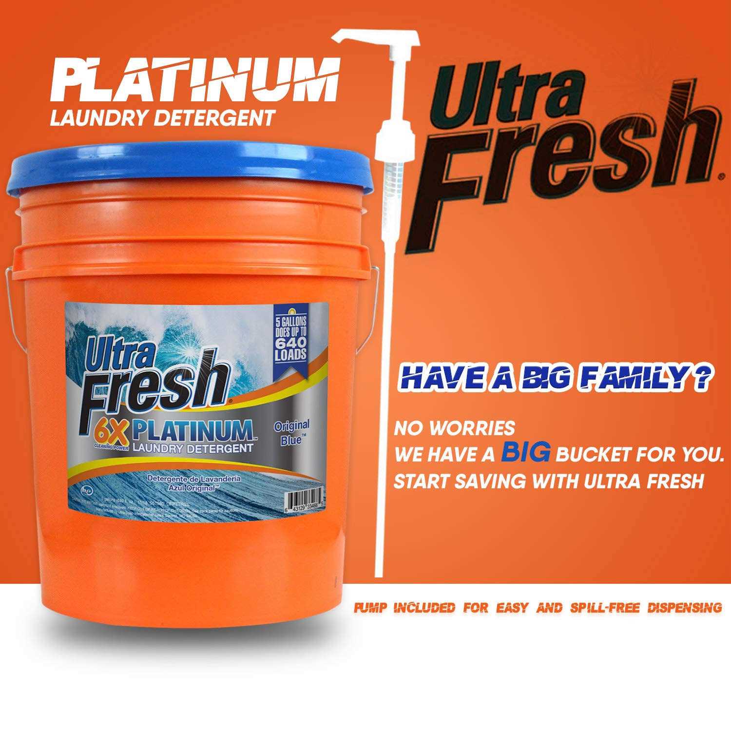 Ultra Fresh Platinum Original Blue 6X Laundry Detergent 6X Deep cleaning power with a clean fresh scent that you already love. Whitens and brightens clothes just like that other blue laundry detergent you have used. It’s concentrated so it does up to 640 loads per 5 gallon bucket. HE so it’s safe for all washing machines and septic systems. Contains no phosphates or bleach.