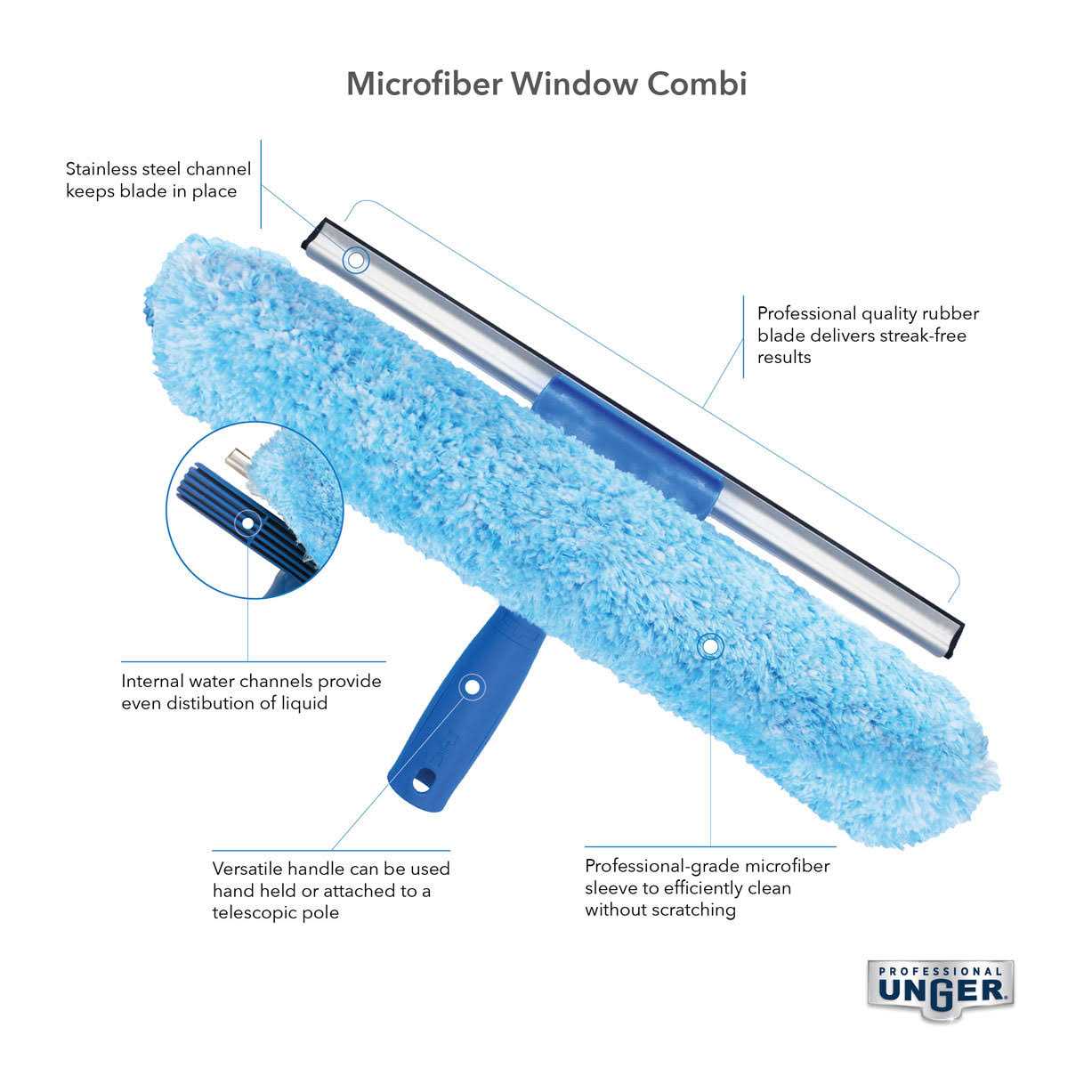 The Microfiber Combi is a 2-in-1 tool that combines both a squeegee and scrubber. The microfiber scrubber wets and cleans the window while the squeegee removes excess water to dry your windows quickly. With the Microfiber Combi, theres no need to switch attachments to get the job done. Our Microfiber Combi uses professional-grade microfiber and the highest quality rubber. It cleans windows effectively, but gently, for streak-free results. Eliminates the need to change attachments for faster, more efficient cleaning. Holds up to 6 time more water than an ordinary cloth and wont scratch glass surfaces. It is machine washable and has reinforced stitching for increased durability. As part of Unger’s Connect & Clean System, the Microfiber Combi attaches to any Unger telescopic pole (sold separately) to extend your reach up to 6.1m The Connect & Clean telescopic poles include a locking cone for an extra secure fit.