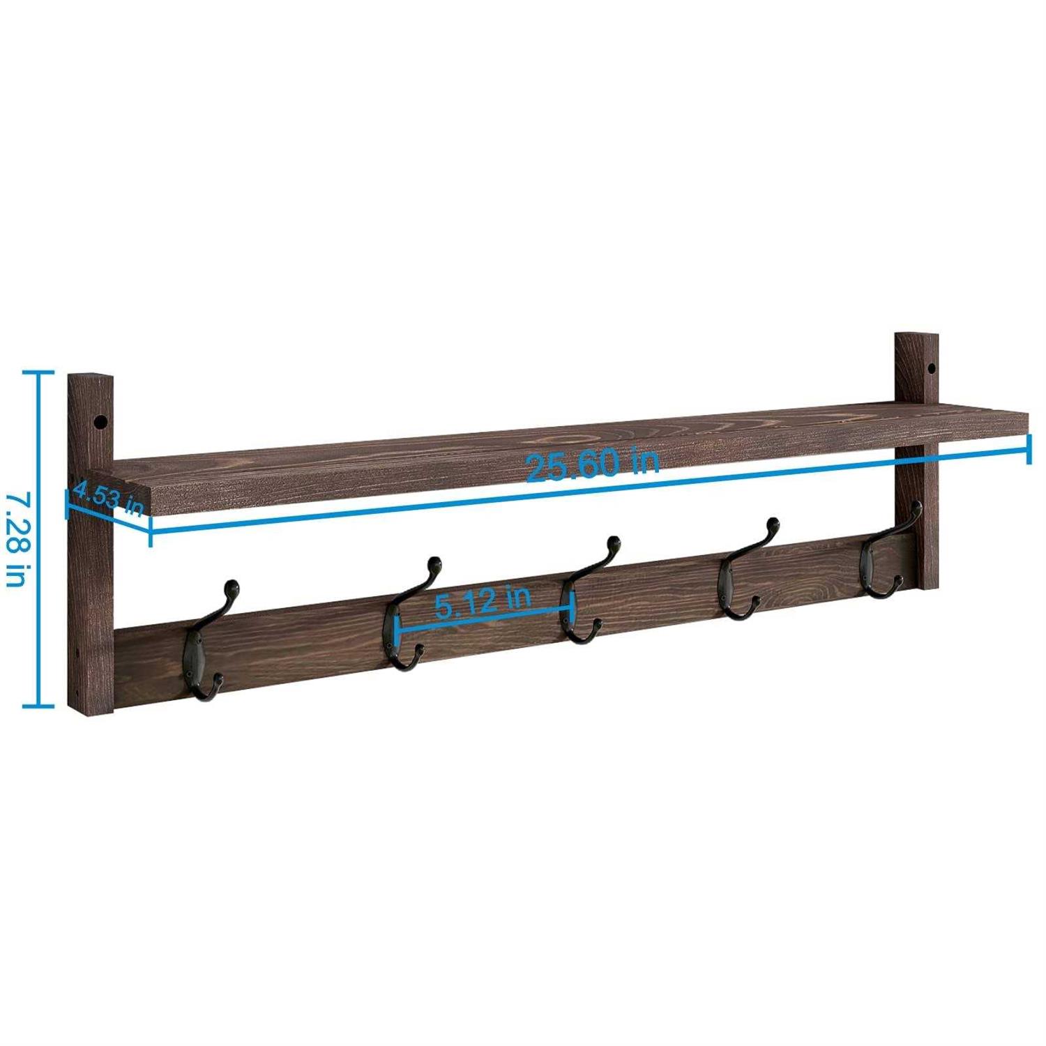 Vertorgan Coat Wall Hooks with Shelf, Wood Coat Rack, Wall-mounted, 25.6 inch Entryway Shelf with 5 Hooks (Brown)