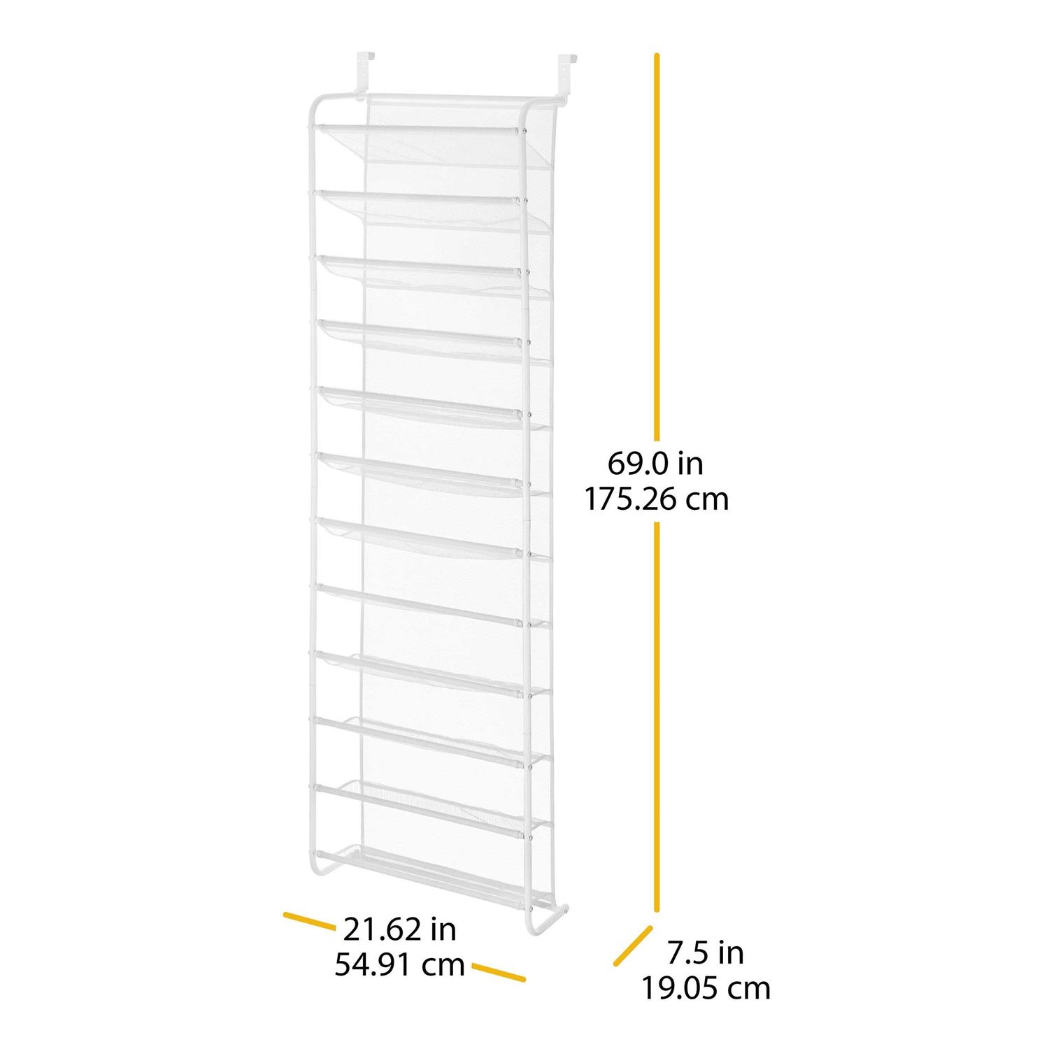 Shoes are an important part of any wardrobe. Whether your collection is all about function or an extension of your style, keeping them neat and accessible means getting out the door a little easier. While using that dead space behind your door, Whitmor’s Mesh and Metal Over-The-Door Shoe Rack holds up to 36 pair of shoes on display to easily find what you are looking for. It saves time while also protecting your investment. The unique metal and mesh design combination optimizes durability and functionality. The mesh-lined back prevents shoes from falling out while protecting door from scuffs. The over-the-door hooks adjust to accommodate varying door sizes. Whitmor is a 4th generation family-owned and operated business. Since 1946, Whitmor has been dedicated to bringing organization home by creating products that simplify everyday life. Ensuring that those products are built with integrity, value, and innovation is our commitment to you. And our promise is that we will always be here for you should you ever need us as we stand behind our product 100%. Whitmor customer service is available in English and Spanish Monday through Friday from 8 am – 4:30 pm CST. Call us and we will gladly assist you in your language. You may contact Whitmor toll-free at 1-888-944-8667 or via email at [email protected]. Size: 7.5 L x 21.625 W x 69.0 H. Color: White.