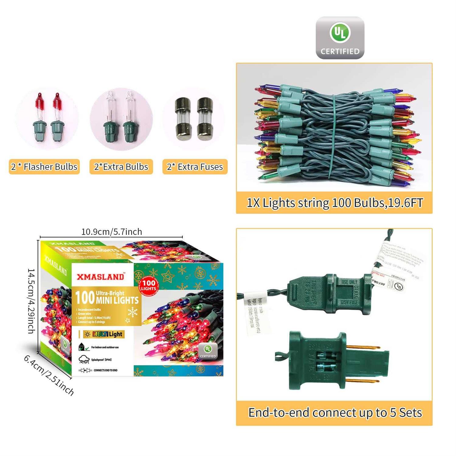 【Ultra-Bright Christmas Light Set】Our 100count Christmas Light Set include ultra-bright bulbs which are much more bright than normal ones(+50% brightness). It is a great way to add a little sparkle to your display. 【Extra-Long Connectable Lights】With the end connector,the mini string light could be extended up with 5 strings(500Lights total)to a long 98ft length,allow you easily installed without additional tools and decorate your lighting area with the desired length. 【Green Wire Christmas String Light】Traditional incandescent Christmas light set,19.6Feet Multi Christmas Mini String Light,each set include 4 Extra Bulbs & 2 Replacement Fuses. – Perfect for indoor and outdoor decoration. – Plug in,put it where you want,watch and enjoy this light. – The light can be reused for many years. 【Steady On & Safety Use】The light set can be always steady on,and easy to fix and replace with spare extra bulbs and fuses when one of the bulbs burn out or break. – Thicker green wire with strong insulated copper core, tangle-free to use. – High quality UL certified products ensure the safety to you and your family. 【Extremely Wide Use】The Mini String Lights are versatile. – Can be used for indoor and outdoor decoration,great for any scence,for example Christmas,Halloween, home,festivals,parties,club,stage,Holidays,shows,restaurant,hotel,commercial building,shopping center,large venue, wedding,and more. XMASLAND Ultra-Bright Connectable Multi Christmas Light Set 100Count 19.6Feet Incandescent Bulb Mini String Light for Indoor Outdoor Christmas Tree Garland Wedding Garden Holiday Party Festival Decor Spare Parts Including: 2 x Flasher Bulbs, 2 x Spare Bulbs, 2 x Replacement Fuses, 1 x Instruction, It is a great way to add a little sparkle to your display.